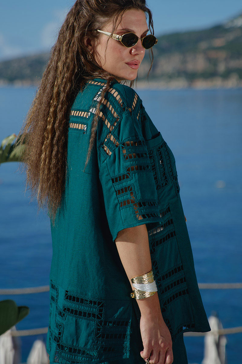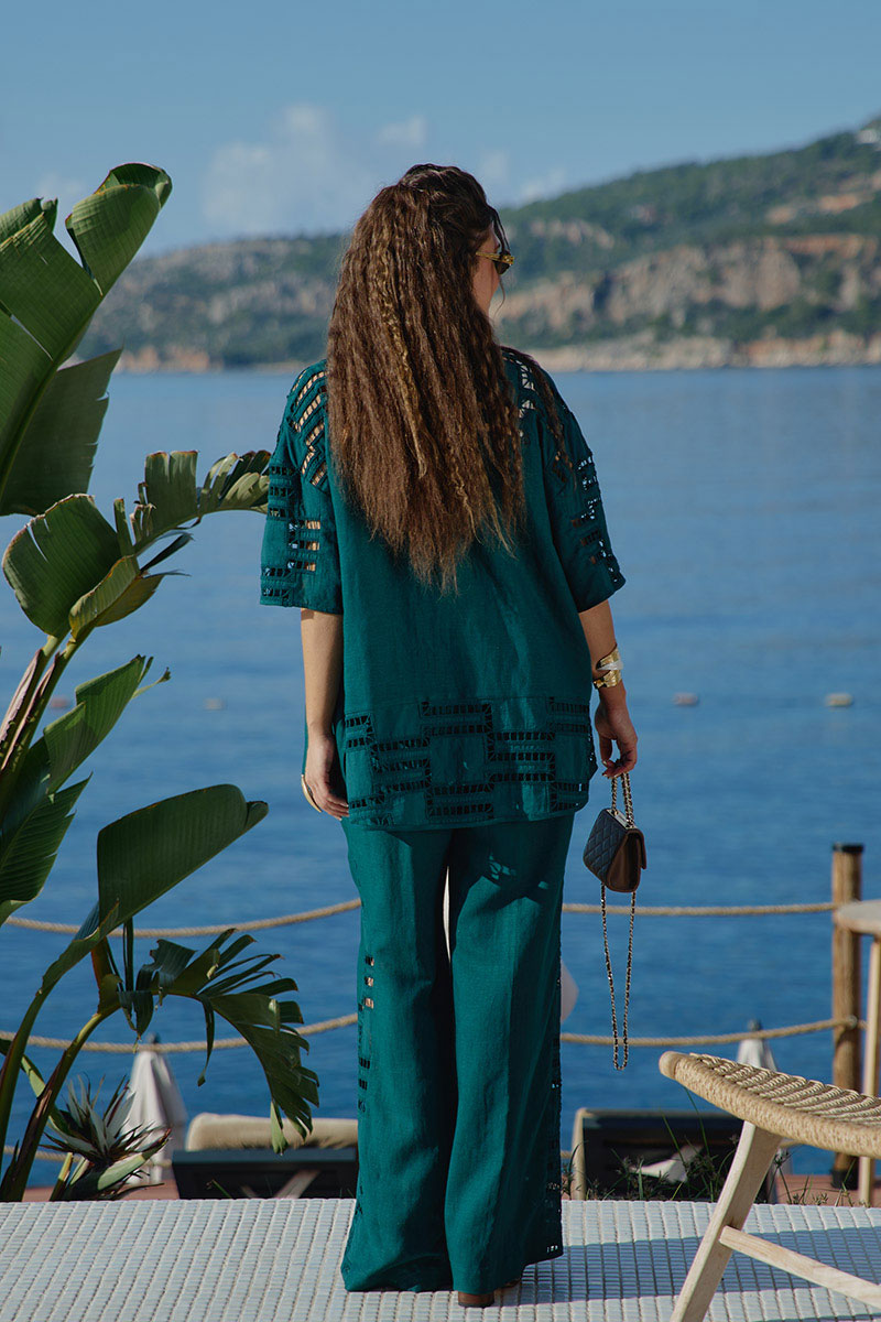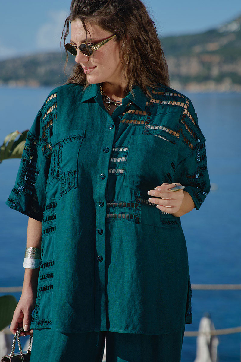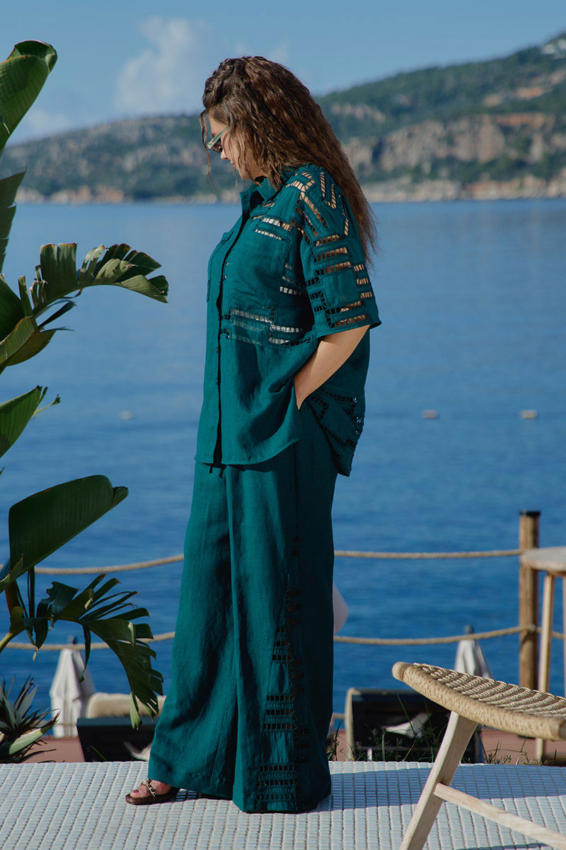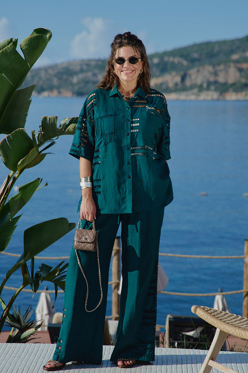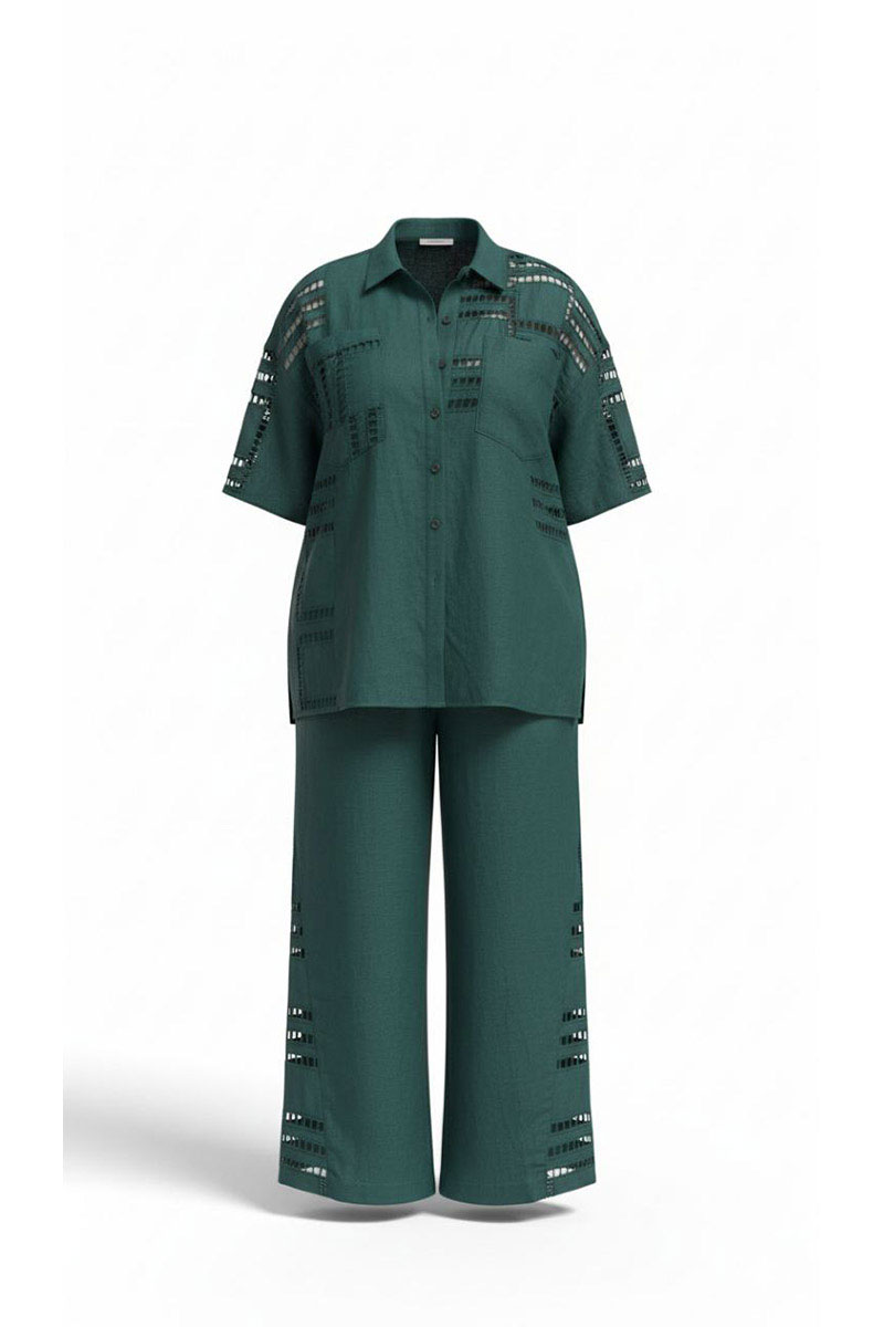 Костюм женский, двух предметный, состоящий из блузки и брюк. Этот костюм — диалог двух противоположностей, которые находят совершенное единство. С одной стороны — вышивка ришелье, сотканная из тончайших нитей и ажурных прорезей. С другой — плотный лён. Вместе они создают образ одновременно утончённый и основательный, лёгкий и монументальный. Несмотря на контраст, обе ткани объединены общей философией. Этот костюм — для женщины, которая любит качественные материалы — ценит тактильные ощущения и долговечность. Костюм с идеальной посадкой подходит для образов как на каждый день, так и для особых случаев. Костюм выглядит сдержанно, монохромно. Блузка свободного силуэта с центральной застёжкой на петли-пуговицы по планке, воротником рубашечного типа, По переду блузки накладные карманы, а также декоративные вставки из отделочной ткани— вышивки ришелье . Линия плеча спущенная, рукав втачной, короткий с вставкой отделочной ткани. Спинка в блузке с отрезной кокеткой «на просвет» из отделочной ткани ришелье. В боковых швах от низа разрезы, для дополнительной динамики. Брюки прямого силуэта с притачным поясом на эластичной тесьме-резинке, что обеспечивает максимально удобную посадку на любой тип фигуры. В боковых швах брюк карманы. По переду брюк от низа декоративные вставки из отделочной ткани — вышивки ришелье. Отделочные элементы — это не просто украшение, это смысловые акценты, расставляющие точки над «i» в данной модели. Обращаем Ваше внимание, что фурнитура может незначительно отличаться от фото.