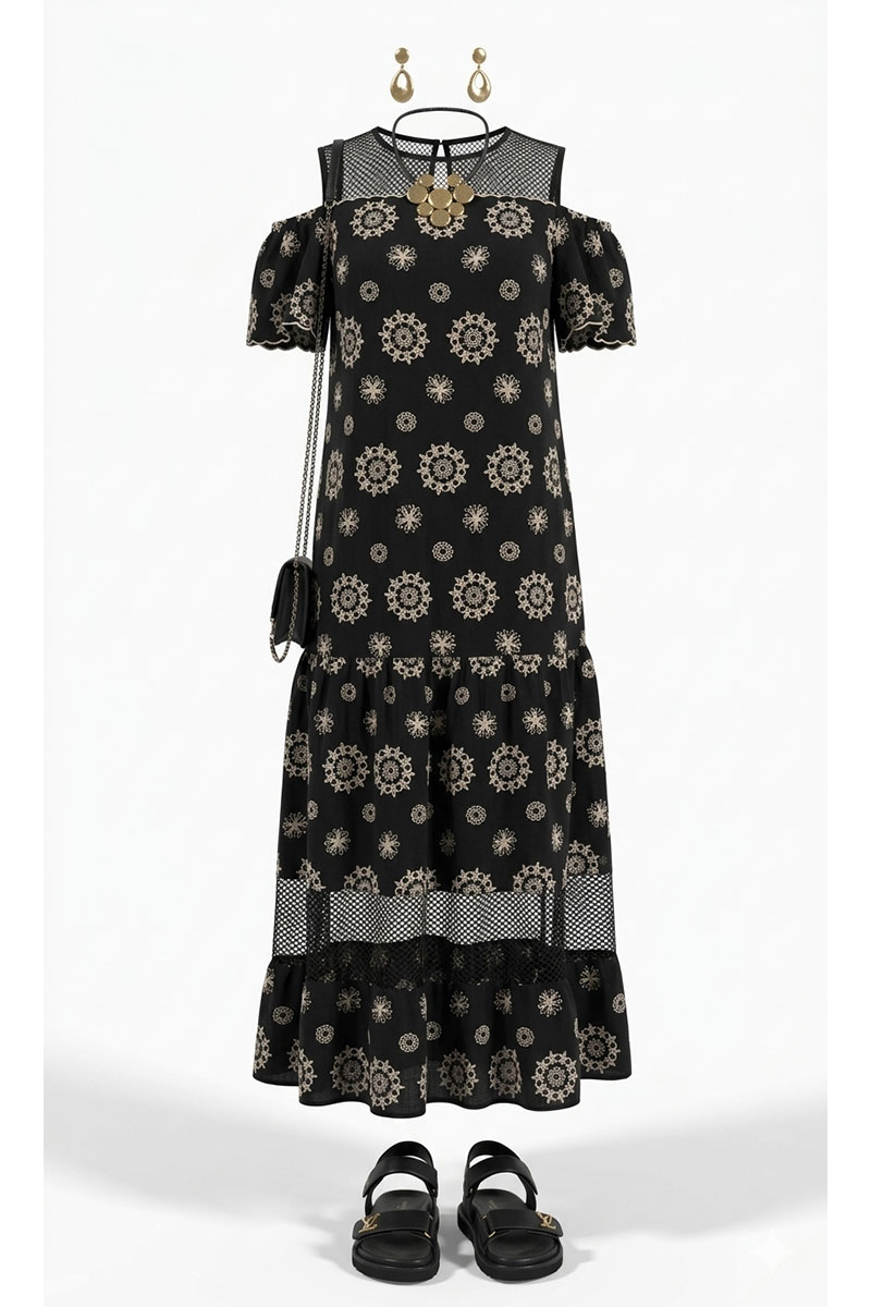 Это платье — воплощение загадочной женственности и изысканной драматичности. Сочетание матового черного крепа и отделочной декоративной сетки создает игру текстур. Платье длины миди балансирует на грани элегантности и соблазна, обещая своей обладательнице внимание и восхищение. Оно для женщины, которая понимает, что настоящая красота часто скрывается в полутонах, что загадка привлекательнее откровенности, а элегантность — вечна. В нем она становится героиней собственного фильма. Платье свободного силуэта, длины «миди». Верхняя часть платья украшена кокеткой, где черная сетка вплетена в основную ткань. Черная сетка — контрастный элемент, вставленный стратегически точно. Она прозрачна, как паутина, но при этом прочна и держит форму. Сетка добавляет платью воздушности, позволяя коже просвечивать сквозь узорчатые ячейки, создавая иллюзию прикрытой наготы. Добавляет платью нотки романтичности так же то, что лиф платья настрачивается декоративными фестонами на кокетку. По переду платья нагрудные вытачки. Рукав втачной одношовный, с оголенным плечом, по верху рукава резинка, что обеспечивает красивую и удобную посадку на любую руку, по низу рукава фестон. Нижняя часть платья оформлена воланами, которые расположены ярусами. Между воланами вставка отделочной ткани— черной сетки.