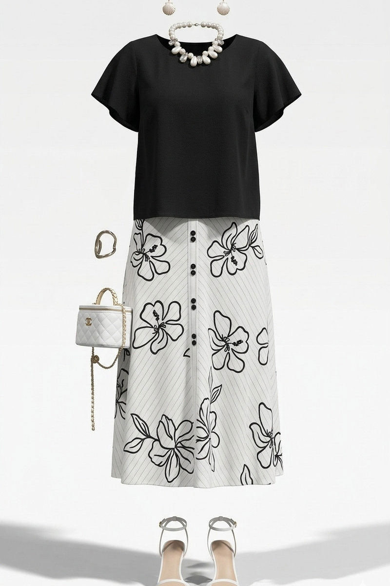 Блуза женская из полупрозрачной чёрной ткани, которая струится по телу, сквозь которую мерцают контуры силуэта. Ткань мягкая, воздушная, почти невесомая, но при этом обладает благородной структурой, которая держит форму. Блуза свободного силуэта, с фигурной формой горловины. Рукава в блузе короткий, на основе реглана. Деталь переда двойная, с нагрудными вытачками. Спинка в блузе с отрезной кокеткой. От подреза деталь спинки выполнена из отделочной ткани в принт-полоску. Отделочная ткань более плотная, с выраженной текстурой. Полоски не просто нарисованы — они тканые, что чувствуется пальцами: можно провести по ним и ощутить рельеф. Низ в блузе фигурный.
