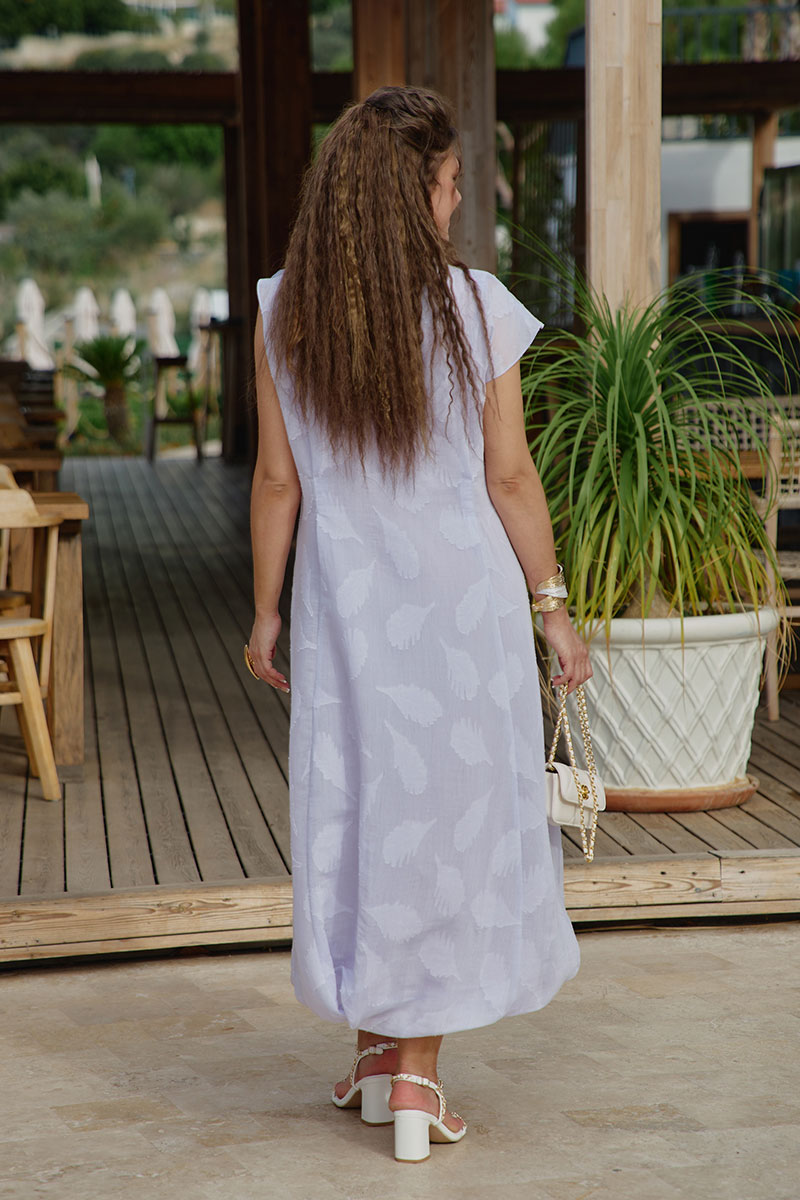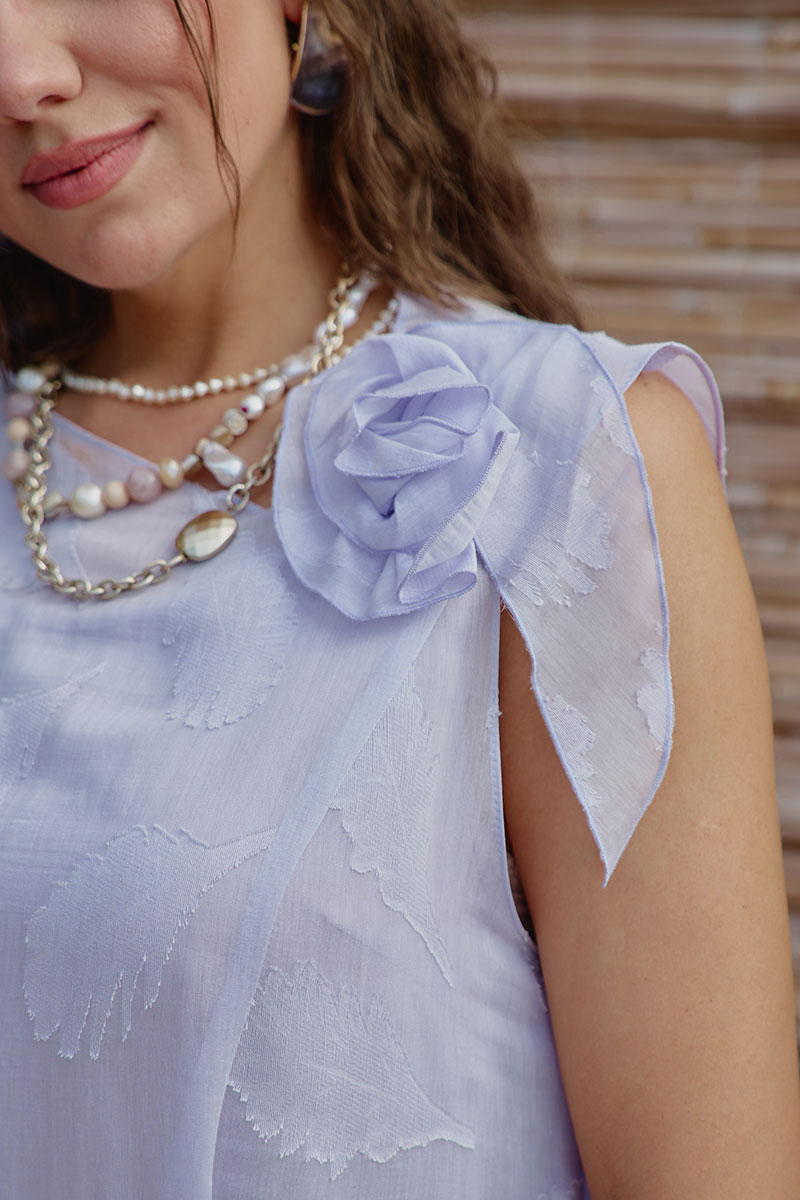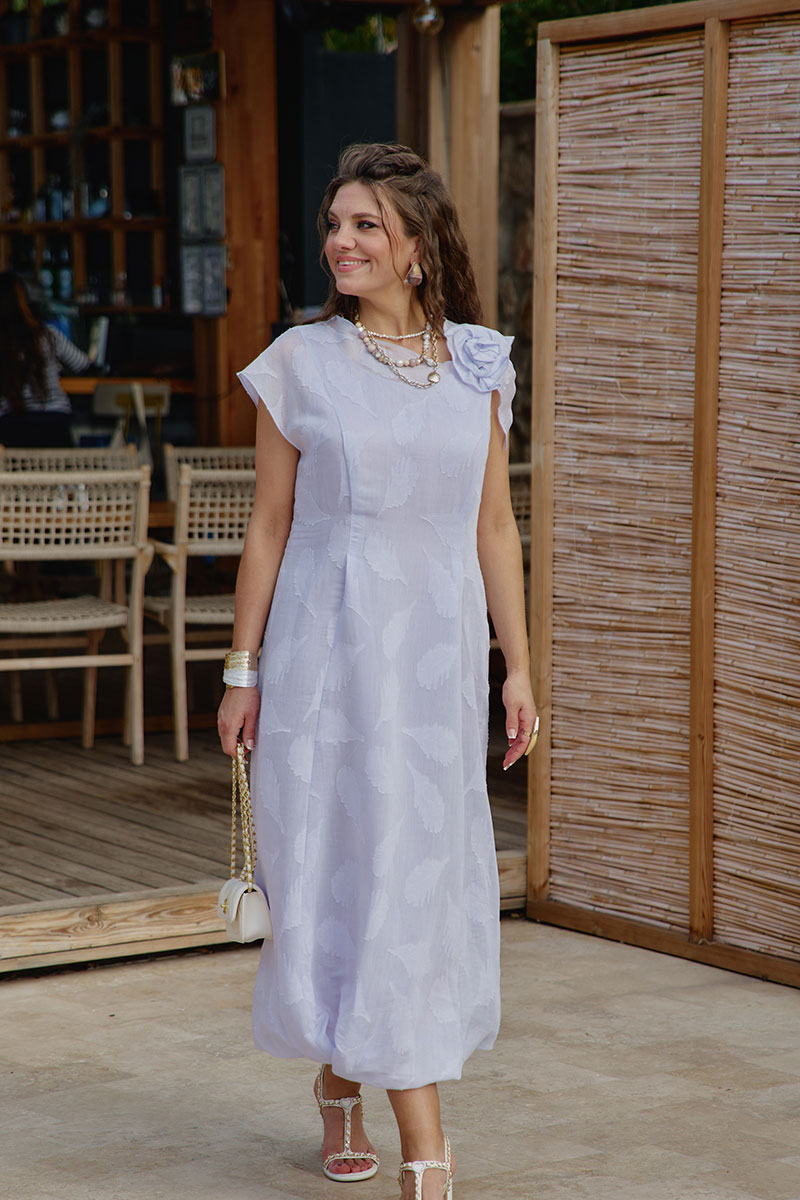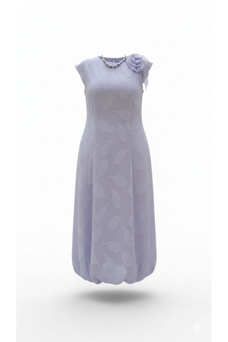 Это платье для тех, кто верит в магию повседневности и умеет находить поэзию в обычных летних днях. Оно создано для мечтательниц, фантазерок и всех, кто помнит, что иногда достаточно надеть правильное платье, чтобы день превратился в сказку. Сиреневый оттенок — это сложная гамма, меняющаяся подобно небу на рассвете: при прямом свете — нежно-лиловый с голубоватым подтоном, в тени — приглушенный фиалковый с сероватым отливом. Полупрозрачный материал, создающий эффект дымки. Ткань пропускает свет, но сохраняет приватность, при движении образует мягкие складки и волны. Фактурный принт — главная особенность ткани, создающая объемную иллюзию. При определенном угле зрения узор "оживает". Платье имеет небольшое прилегание расширяясь к низу. Верхний слой платья по низу закладывается в складки и «заболонивается» на подкладку. Форма баллона создает ощущение воздушности. Горловина в платье имеет ассиметричный фигурный вырез. По переду и спинке платья вертикальные рельефы от плечевых швов до низа, на уровне талии застрачиваясь в неглубокие складки. Линия плеч в платье ассиметричная, пройма углублена. В боковом шве платья застёжка на потайную тесьму-молнию. Съёмная брошь-роза — изысканный акцент, выполненный из той же ткани. Она добавляет в образ романтические нотки. Платье на подкладке.