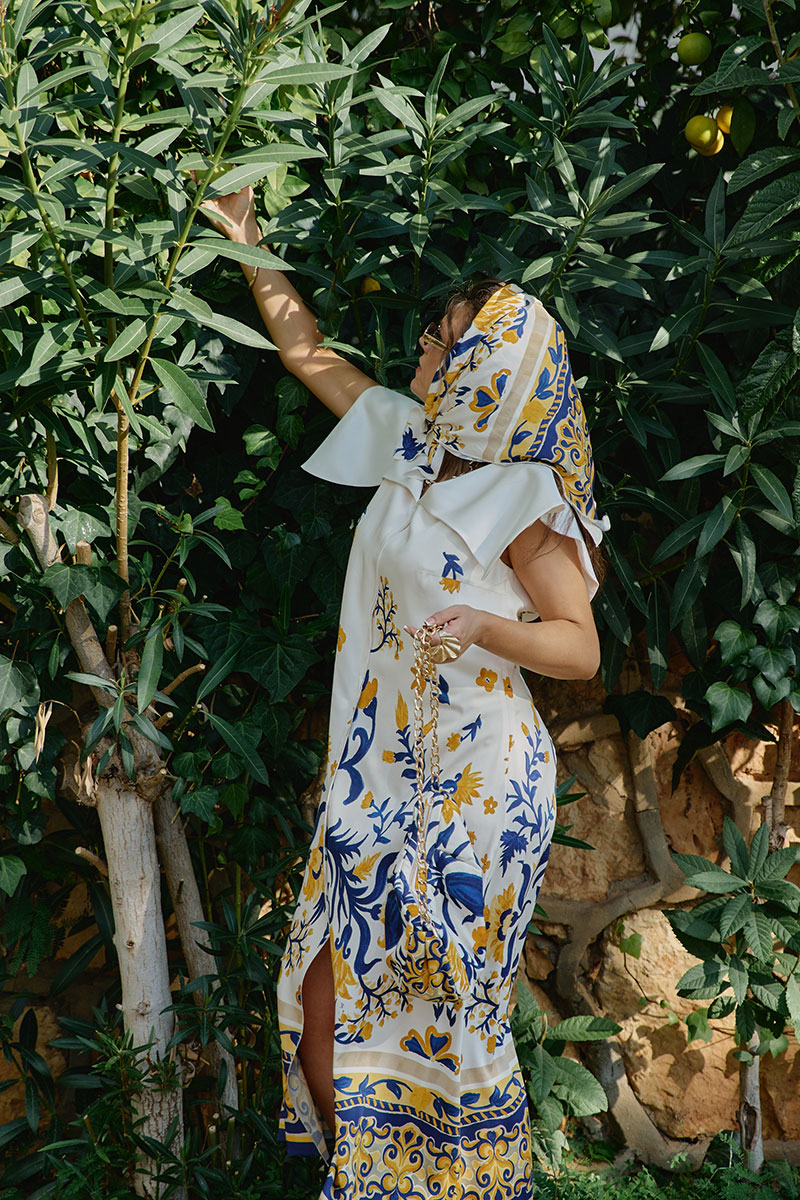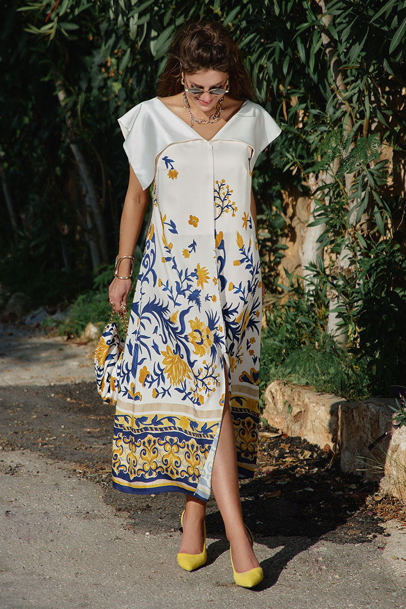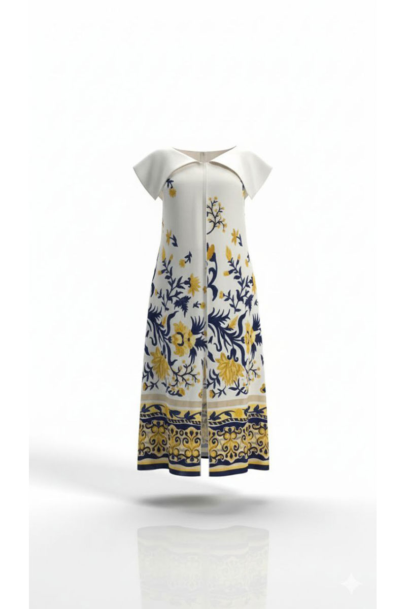 Платье женское не просто одежда, а перенесённый на ткань кусочек итальянского лета. Яркий цветочный принт на светлой основе напоминает о залитых солнцем тосканских холмах, о внутренних двориках с терракотовыми горшками, о рынках, где горами лежат спелые овощи и фрукты. Это гимн средиземноморской радости жизни, воплощённый в данной модели. Принт — это не случайный узор, а тщательно составленная композиция, вдохновлённая итальянской флорой и искусством. Платье А- силуэта, с плавным V- образным вырезом горловины, отложным ассиметричным воротником из отделочной ткани. По переду платья нагрудные выточки. Отделочным элементом платья является необычный отделочный элемент, такой как — левые и правые делали переда и спинки стачиваются на «ребро» до определённого момента переходя в разрез. В боковом шве платья застёжка на потайную тесьму-молнию. Платье на подкладке.