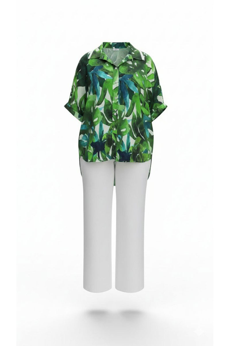 Эта блукка — словно кусочек жаркого лета, пойманный в летящей ткани. «"Оверсайз" (свободный/объемный крой)» силуэт создает ощущение свободы и небрежной элегантности, а яркий «тропический» принт напоминает о