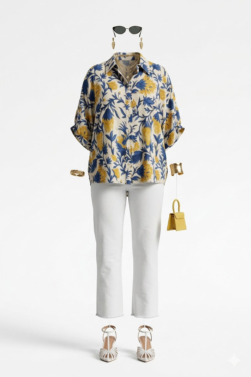 Эта блука — словно кусочек итальянского лета, пойманный в летящей ткани. «Оверсайз» силуэт создает ощущение свободы и небрежной элегантности, а яркий итальянский принт напоминает о солнечных террасах, виноградниках Тосканы и лазурном побережье Амальфи. Это не просто одежда — это настроение, застывшее в ткани, готовое оживить любой образ щедростью южного солнца. Ткань на ощупь прохладная и шелковистая, она струится по телу, повторяя каждое движение, словно второе дыхание летнего бриза. Крой создает эффект намеренно свободного, но стильного образа. Блузка «оверсайз» силуэта с центральной застёжкой на петли-пуговицы по планке, воротником рубашечного типа со вставкой декоративной бахромы. Рукав в блузе цельнокроеный со сборкой на притачной манжет по низу. По спинке блузки отрезная кокетка со сборкой от подреза. Низ в блузке ассиметричный, фигурной формы. Эта рубашка создана для современной женщины, которая ценит комфорт, не жертвуя стилем, и помнит, что настоящая элегантность — в умении быть собой в любой ситуации.