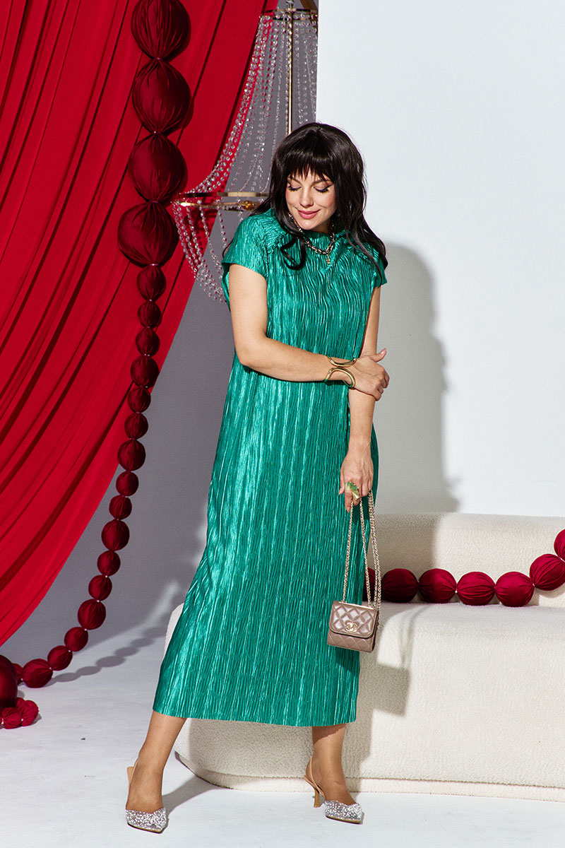 Платье прямого силуэта из фактурной ткани с крэш-эффектом, который создает в силуэте вертикальные заломы визуально вытягивающие фигуру и придает модели выразительный образ. Короткий