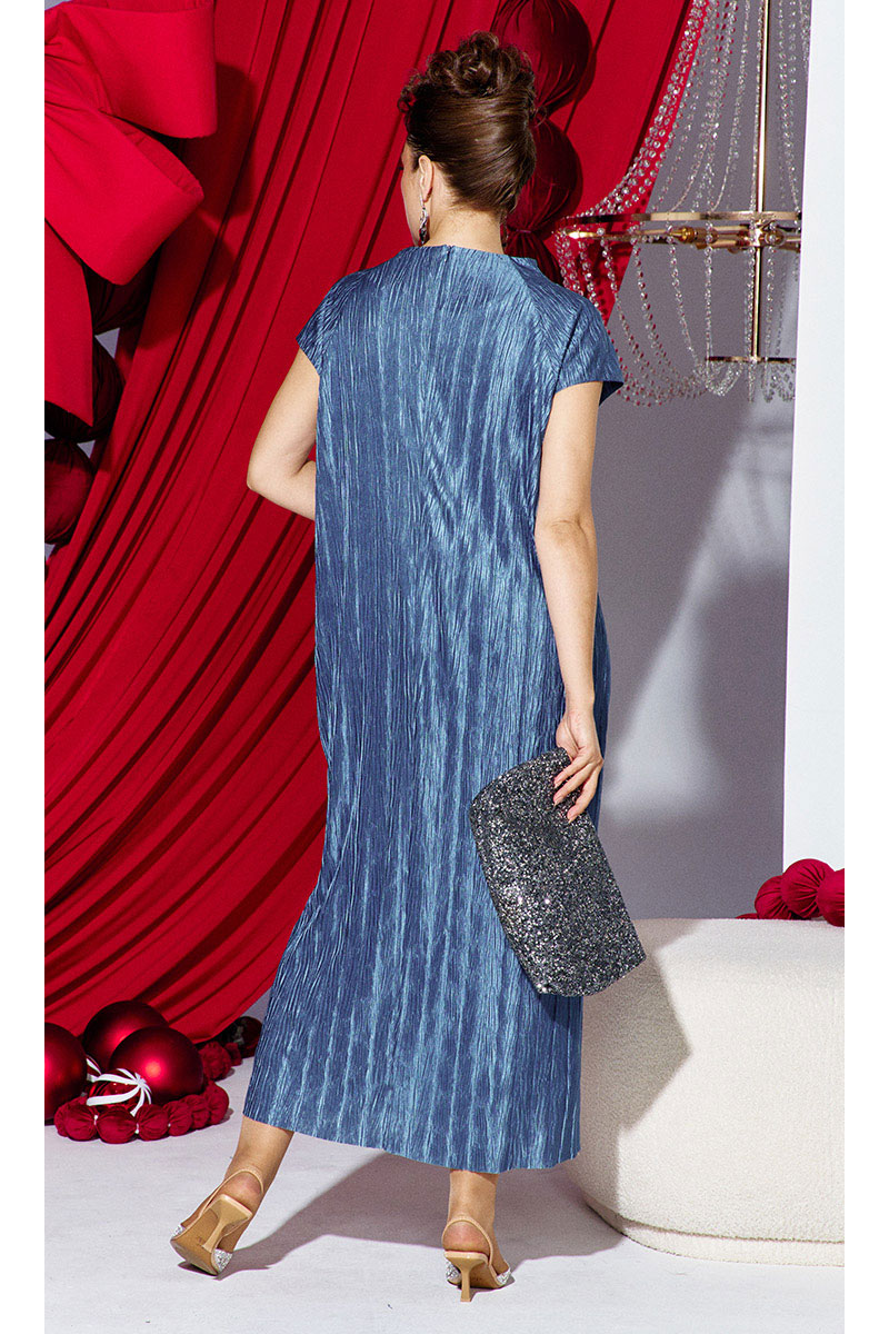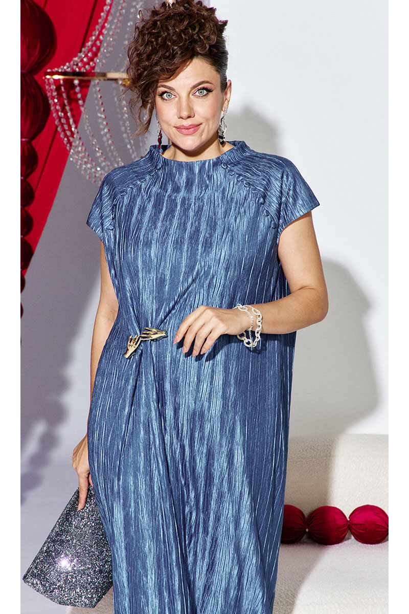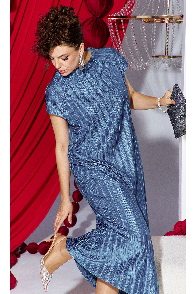 Платье прямого силуэта из фактурной ткани с крэш-эффектом, который создает в силуэте вертикальные заломы визуально вытягивающие фигуру и придает модели выразительный образ. Короткий