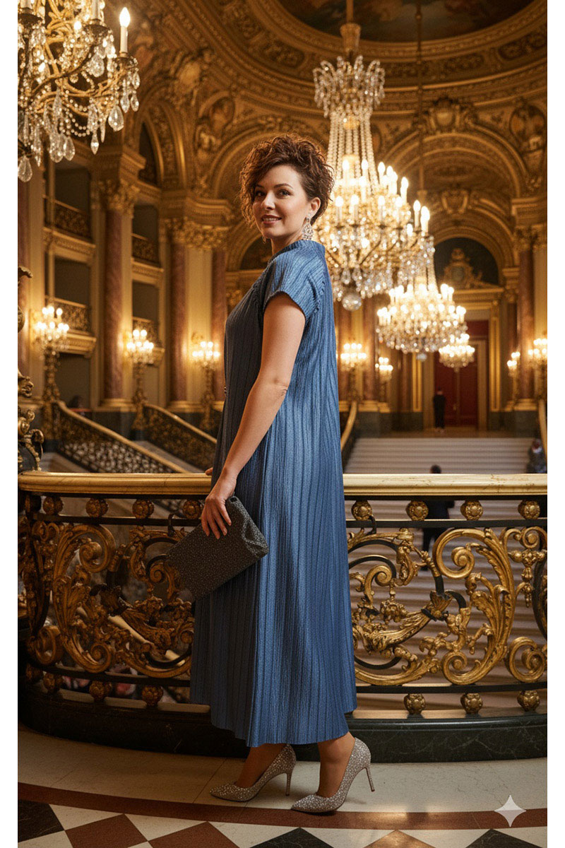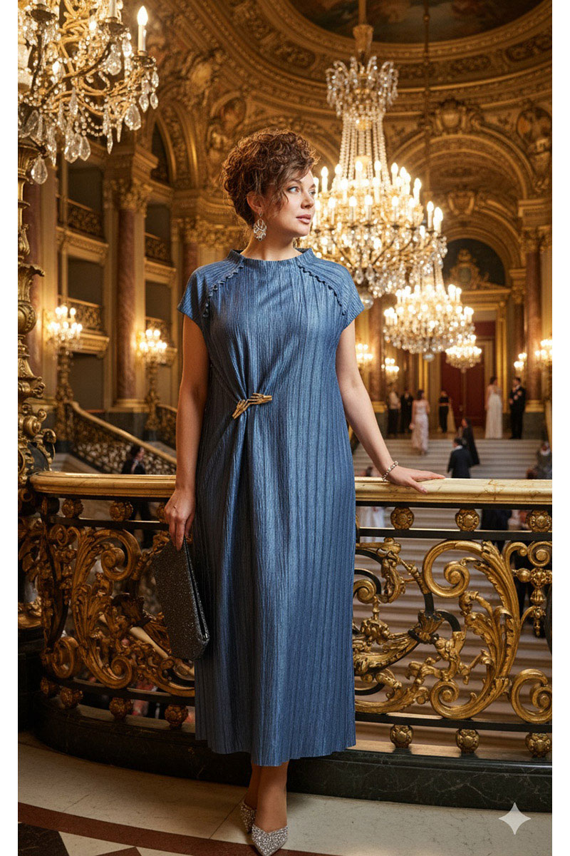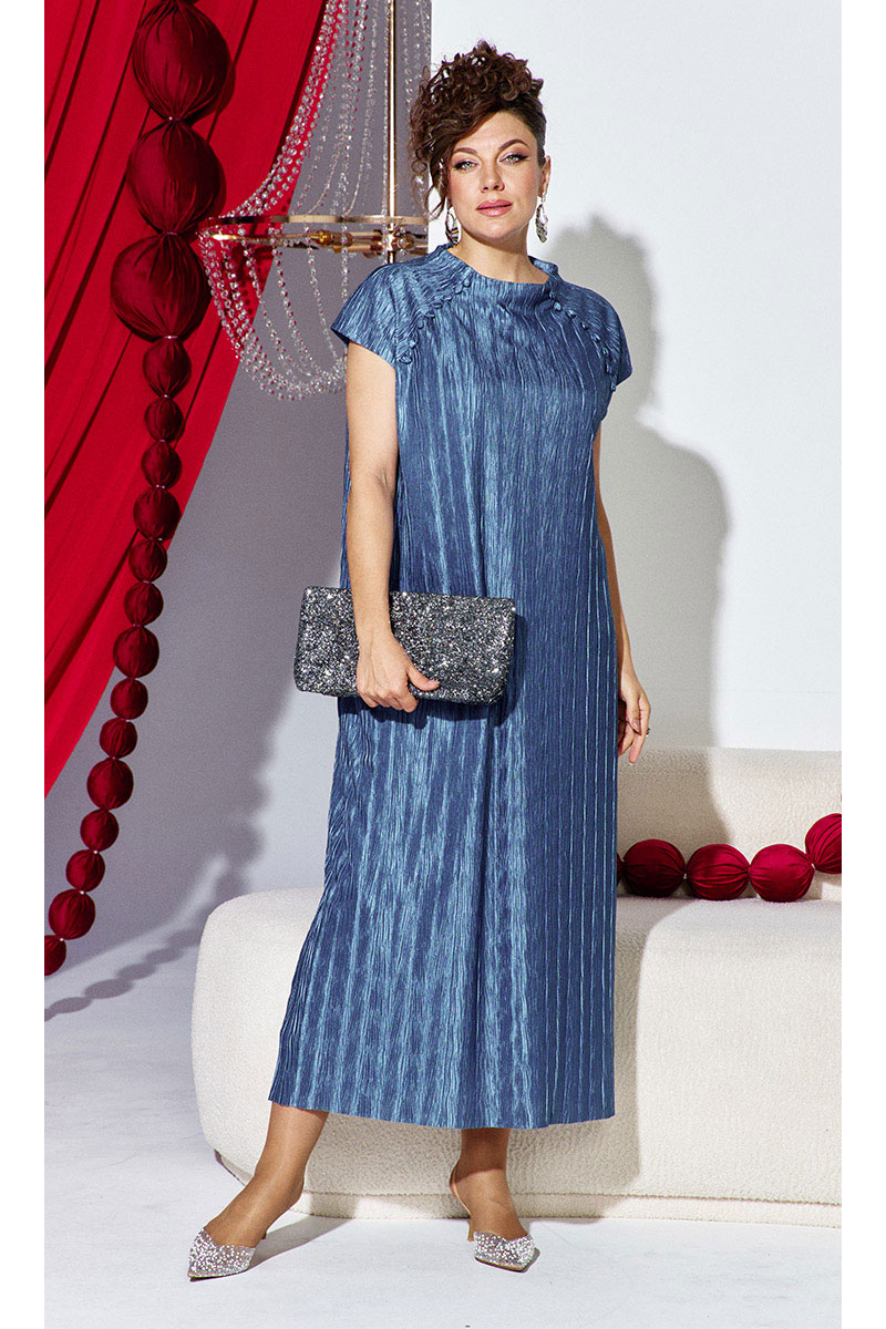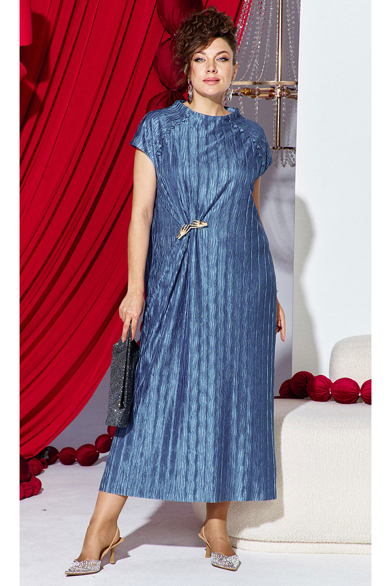 Платье прямого силуэта из фактурной ткани с крэш-эффектом, который создает в силуэте вертикальные заломы визуально вытягивающие фигуру и придает модели выразительный образ. Короткий