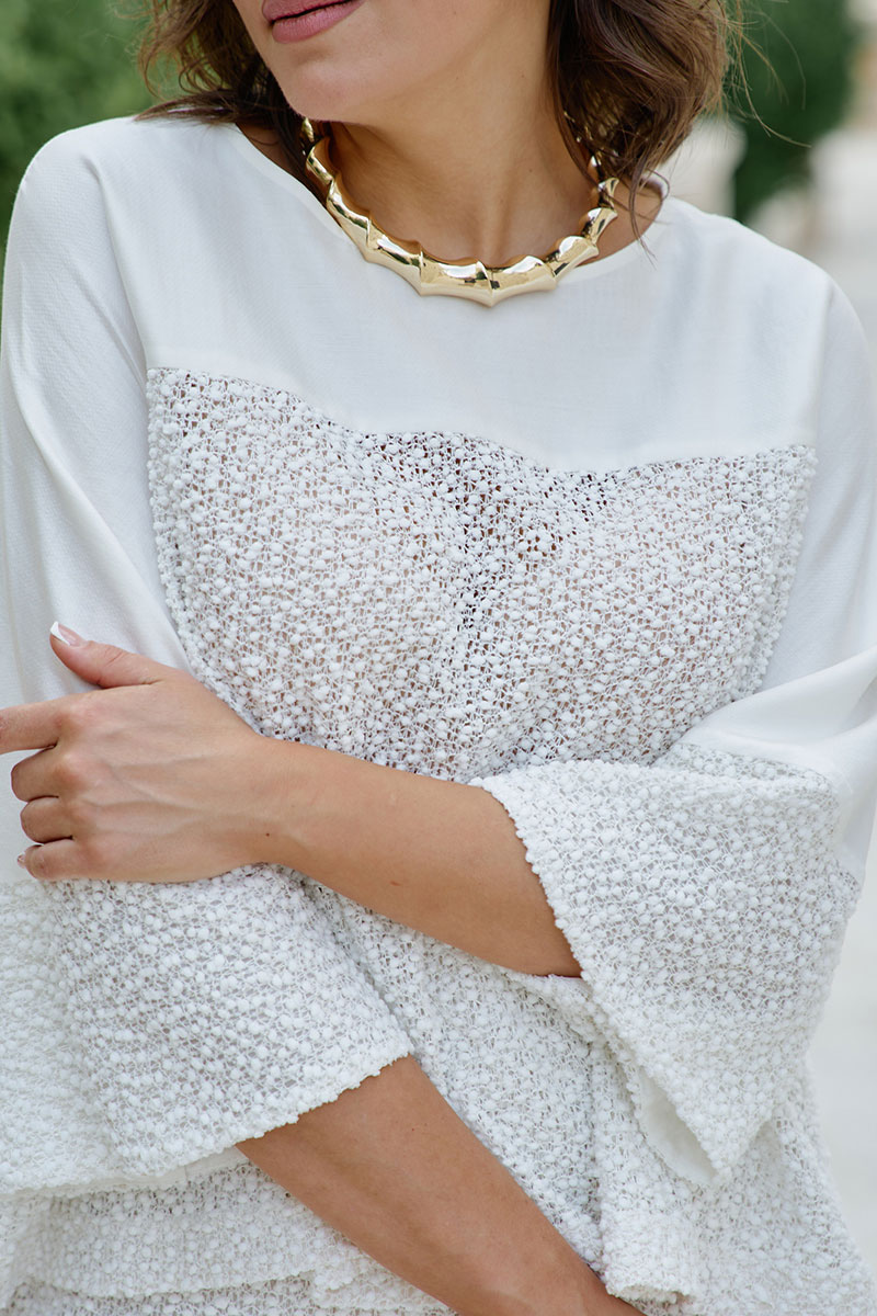 Блуза женская для повседневной носки и торжественных случаев из вуали и трикотажа с нитью букле которая представляет собой нити с рыхлой узелковой структурой, отдаленно напоминающей каракуль. Ткань нежная, приятная на ощупь. Она создает ощущение легкости и кокетливости одновременно. Блуза в романтическом стиле с классическим, полуприлегающим силуэтом. Пластическая форма мягкая, плавная. Блуза создана из двух видов материала: тонкой вуали и трикотажа-букле. Плечевой пояс наклонный, естественной ширины с плавным переходом в линию рукава. Рукав цельнокроенный с широким притачным манжетом, укороченный. Блуза расширена к низу. Она создаст неповторимый образ на концерте, свидании, торжественном мероприятии. Ее удобно носить в ресторане, в ней так же выгодно будет выглядеть любая женщина на свадьбе, выпускном. Это стильный женственный современный образ, который по праву будет занимать достойное место в вашем гардеробе. Модель комфортная, в тренде сезона современного фасона из качественных материалов делает выгодный акцент на фигуру и идеально сидит на любой даме благодаря расклешённому крою, он приятна к телу, невесома на плечах станет любимой для приятных прогулок и встреч.