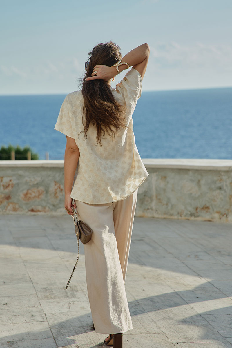Блуза летняя из фактурного материала для повседневной носки и торжественных случаев небольшого объема. Пластическая форма модели мягкая, плавная. Изделие прямого силуэта без подкладки с цельнокроенными короткими рукавами с декоративными рельефами от горловины к нижней части рукава, что визуально сужает плечевой пояс. В рельефах у линии горловины декоративный ряд пуговиц с имитацией застежки на навесные петли. По боковым швам небольшие разрезы. Блуза свободного кроя незаменима летом, натуральный материал придает ей особую ценность, она идеально сидит на фигуре и создает стильный образ для города. Блуза уместна в отпуске, прогулке, свидании, торжестве, свадьбе, смотрится дорого за счет современного кроя и продуманности деталей. Это ваша находка для стильного и удобного летнего образа.