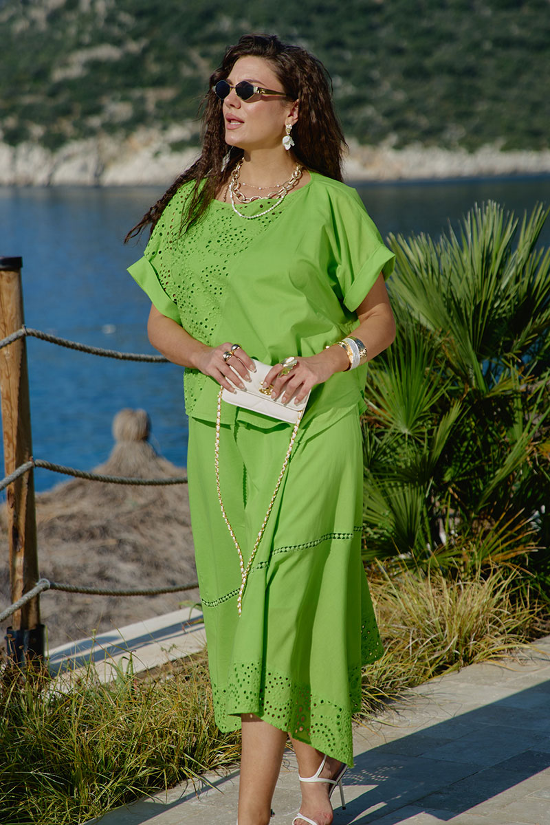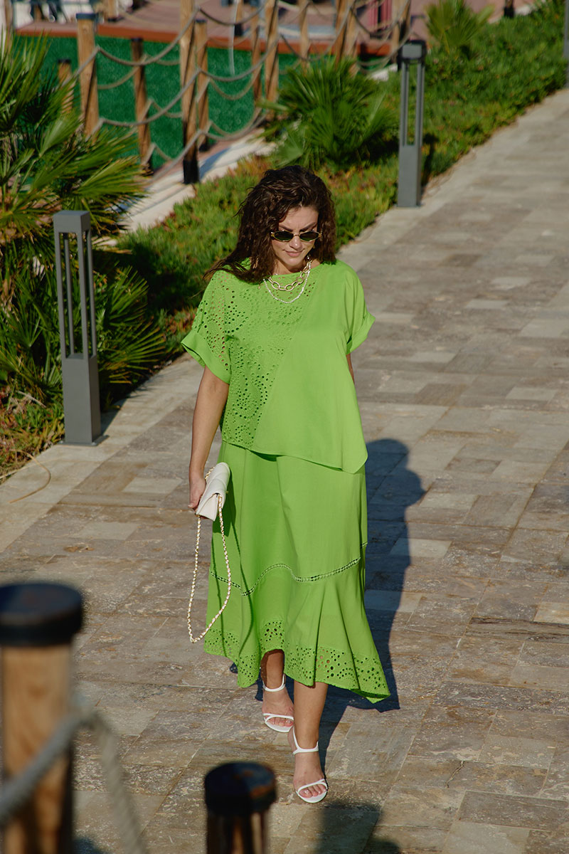 Комплект женский, двух предметный, состоящий из блузы и платья. Этот комплект — не просто одежда, а настоящее летнее настроение, застывшее в ткани. Он говорит о женщине, которая ценит красоту в деталях, смело экспериментирует с формами и цветами, и при этом сохраняет врожденное чувство стиля и гармонии. Комплект мастерски сочетает в себе: воздушность ажурного ришелье; сочность салатового цвета; динамику асимметричных линий, элегантность классического кроя. Блуза свободного силуэта, с округлой формой горловины. Рукав в блузе цельнокроеный с притачной фигурной манжетой по низу. По переду и спинке блузы диагональный подрез с декоративной вставкой из вышивки ришелье. Низ в блузе фигурной формы, создавая динамичный, летящий силуэт. Платье А-силуэта, длины «миди». Основная часть платья выполнена из однотонной ярко-салатовой ткани. Этот оттенок оживляет кожу, придает лицу свежесть, а глазам — особый блеск. Силуэт платья мягко облегает фигуру, не стесняя движений. Широкие бретели — стильный акцент, который одновременно практичен и элегантен. Они уверенно лежат на плечах, подчеркивая их линию, и переходят в глубокий вырез, открывающий ключицы. Горловина в платье округлой формы, по переду нагрудные вытачки. По низу платья притачной волан со вставкой «на просвет» декоративного кружева. Нижний ассиметричный волан из отделочной ткани — кружева. Асимметричный волан — главное украшение платья. При движении волан колышется, создавая иллюзию, будто платье живет своей собственной, таинственной жизнью. Платье на подкладке.