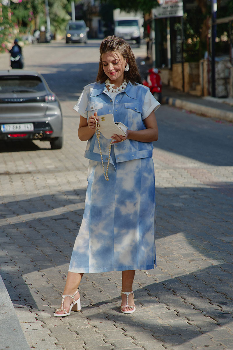 Просто роскошный костюм, который обязан быть в гардеробе у каждой модницы! Невероятный принт, текстура ткани с лёгким блестящим напылением создадут образ, в котором вы будете блистать. Костюм женский, состоящий из жилета и юбки. Жилет прямого силуэта с центральной застёжкой по планке на декоративные кнопки, воротником рубашечного типа и притачным поясом по низу. По переду жилета отрезная кокетка, декоративный клапан и фигурные рельефы. Спинка в жилете с отрезной кокеткой. В качестве дополнительной декоративной отделки жилета- отделочные двойные строчки контрастного цвета. Юбка прямого силуэта длины миди. Пояс притачной со вставкой резинки в бочках, по переду рельефы, застежка в среднем шве на тесьму молнию в гульфике и пуговицу в поясе. По переду юбки фигурные прорезные карманы. По заднему полотнищу юбки средний шов и декоративная листочка кармана. В боковых швах юбки разрезы. В качестве дополнительной декоративной отделки юбки –декоративные отделочные двойные строчки контрастного цвета.