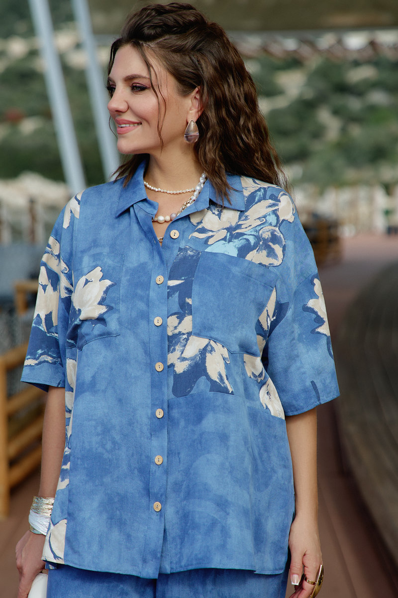 Блузка свободного силуэта с центральной застёжкой на петли-пуговицы по планке, воротником рубашечного типа, По переду блузки накладные карманы, а также декоративные вставки из отделочной ткани с принтом. Линия плеча спущенная, рукав втачной, короткий с вставкой отделочной ткани с принтом. Спинка в блузке с отрезной кокеткой. В боковых швах от низа разрезы, для дополнительной динамики.