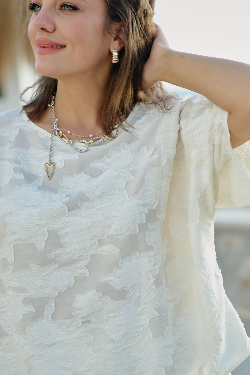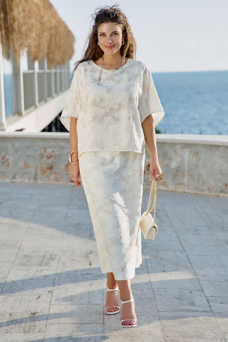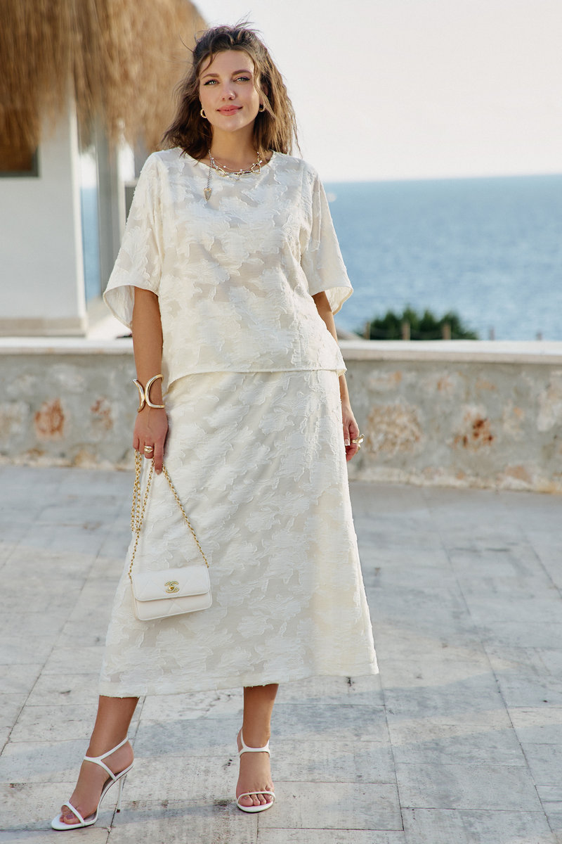 В мире, где часто приходится выбирать между практичностью и красотой, этот блузон предлагает третье — искусство повседневности, которое можно носить на себе, как вторую кожу, но которая гораздо интереснее первой. Летний блузон молочного оттенка с объёмным фактурным принтом — это не просто предмет одежды, а носимое искусство. Он сочетает в себе скульптурность рельефных узоров и нежность пастельного оттенка, свободный силуэт и сложную фактуру. Блузон свободного силуэта, укороченный. Горловина округлой формы. По переду и спинке блузона вертикальные рельефы. Рукав цельнокроеный с фигурной линией низа. По спинке блузона застёжка на тесьму-молнию. Низ в блузоне ассиметричный. Советы по носке: не перегружать аксессуарами — фактура уже самодостаточна, сочетать с простым низом — чтобы блузон был звездой образа, играть с длиной — заправлять или носить навыпуск.