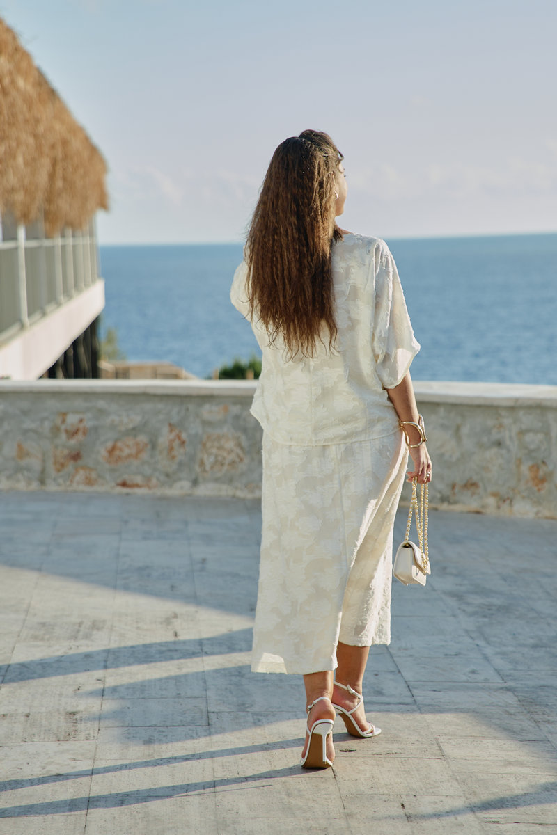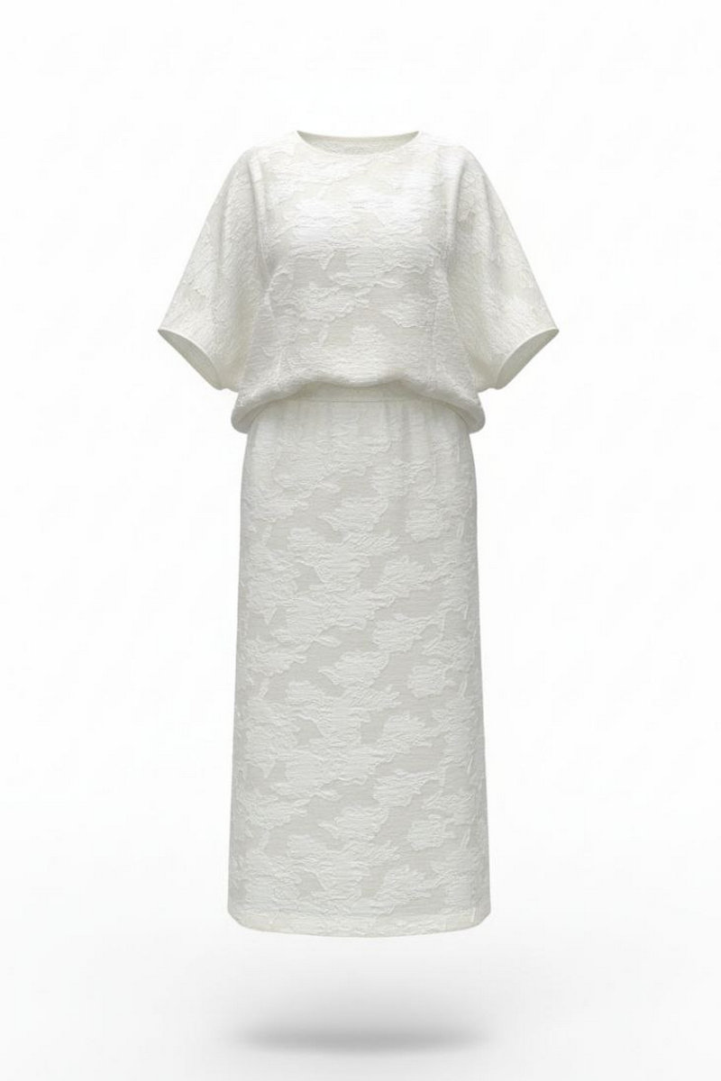 Юбка А-силуэта молочного оттенка с фактурным принтом — это выбор женщины, которая: ценит элегантность в движении — а не статичную красоту, любит тактильные ощущения — наслаждается прикосновением ткани, предпочитает мягкую женственность — без агрессивных линий, обладает вкусом к деталям — замечает красоту в текстурах, не боится быть заметной — но делает это изящно. В мире, где часто приходится выбирать между комфортом и стилем, эта юбка предлагает и то, и другое — свободу движения и утончённость линий, практичность кроя и художественность фактуры. Это не просто предмет гардероба — это заявление о подходе к жизни: можно быть одновременно и сильной, и нежной, и современной, и романтичной, и простой, и сложной. Юбка длины миди — это воплощение элегантной непринужденности. Она опускается ровно до середины икры, открывая изящные щиколотки. Юбка расклешенная, длины миди с притачным поясом со вставкой эластичной тесьмы-резинки в бочках. По спинке юбки застёжка на потайную молнию и пуговицу в поясе. Юбка на подкладке.
