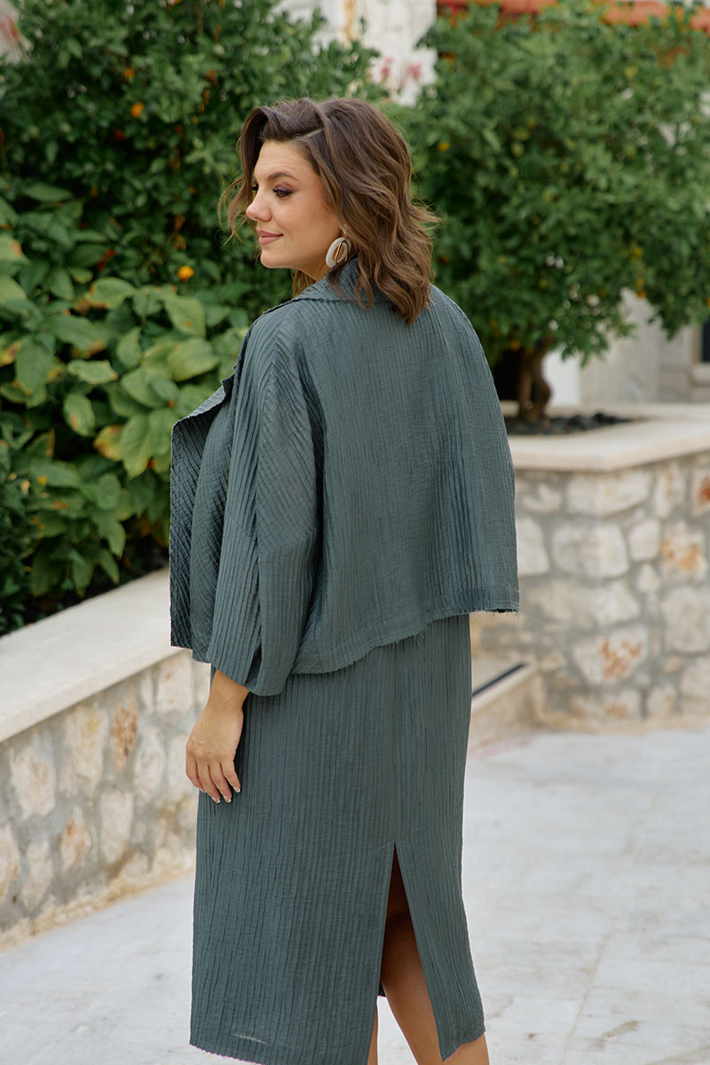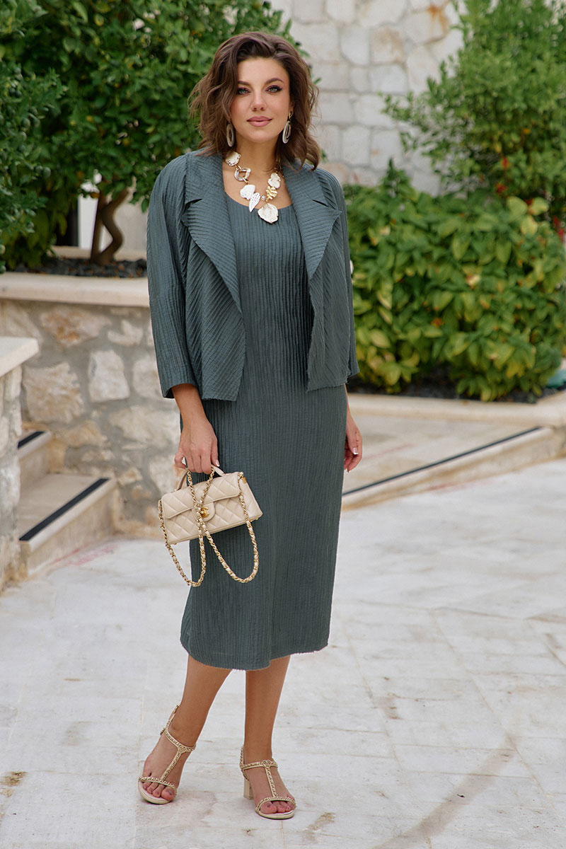 Стильный костюм, состоящий из жакета и платья, сочетает в себе летнюю расслабленность и деловую элегантность.
