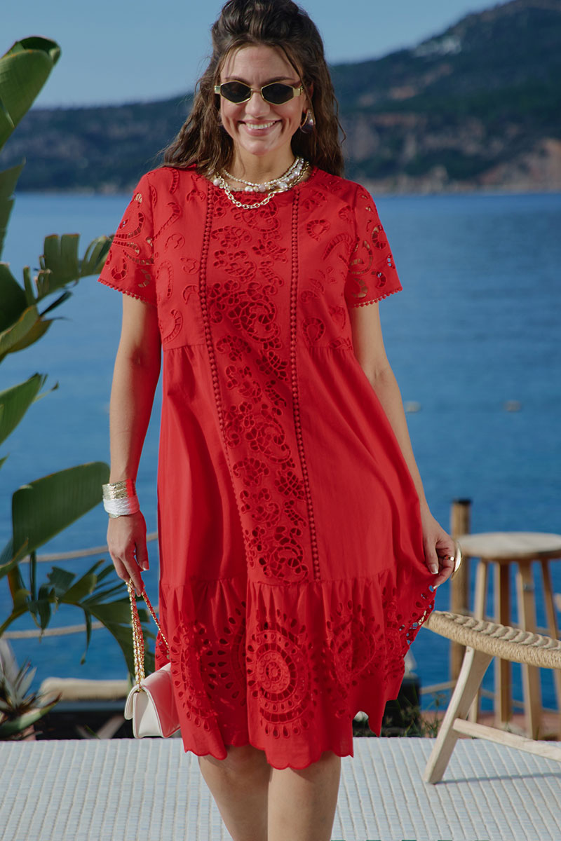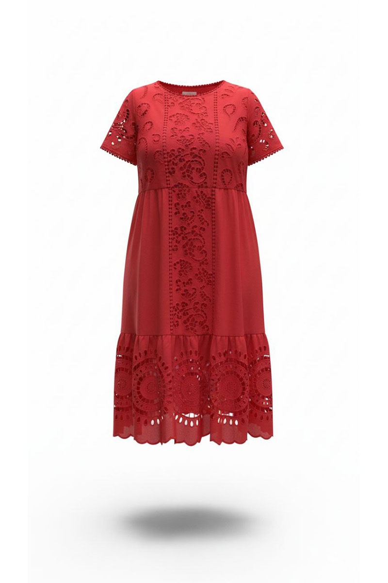 Это летнее платье в гармоничном сочетании ткани ришелье и однотона, составляет идеальную симфонию из легкости и романтики, оно будто символизирует безмятежные дни, наполненные нежностью лета. Легкая ткань, окутывающая фигуру, нежно струится при каждом движении, создавая ощущение воздушности. Это платье идеально подойдет для летнего дня — будь то прогулка по жаркому пляжу, ужину на террасе или торжественный праздник на свежем воздухе. В таком образе каждая женщина чувствует себя как настоящая фея лета. Огромным достоинством этого платья становятся вставки из ришелье — изысканного ажурного кружева. Платье свободного силуэта, с округлой формой горловины оформленной декоративным кружевом; вставкой из ришелье по центру платья с декоративным кружевом по краям. Платье с подрезом выше уровня талии со сборкой от подреза, лиф из ришелье. Спинка с вставкой из ришелье по кокетке и сборкой от подреза. Рукав в платье втачной из ришелье на просвет, с кружевом по низу. По низу платья притачной волан из ришелье с фестонами по низу и сборкой от подреза.
