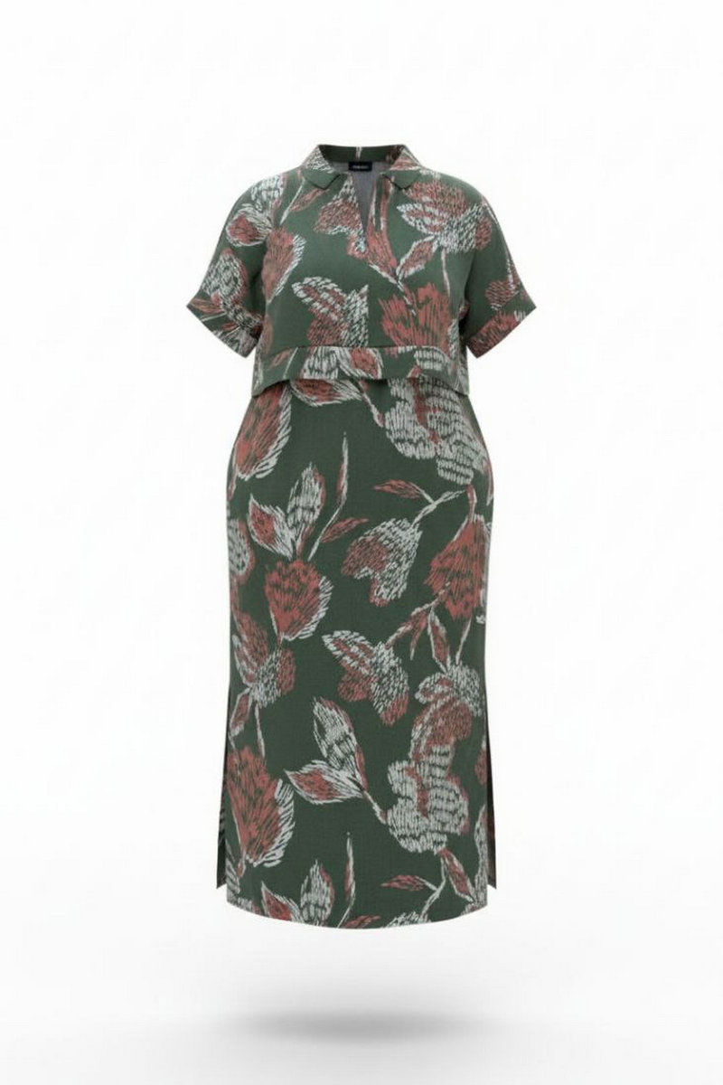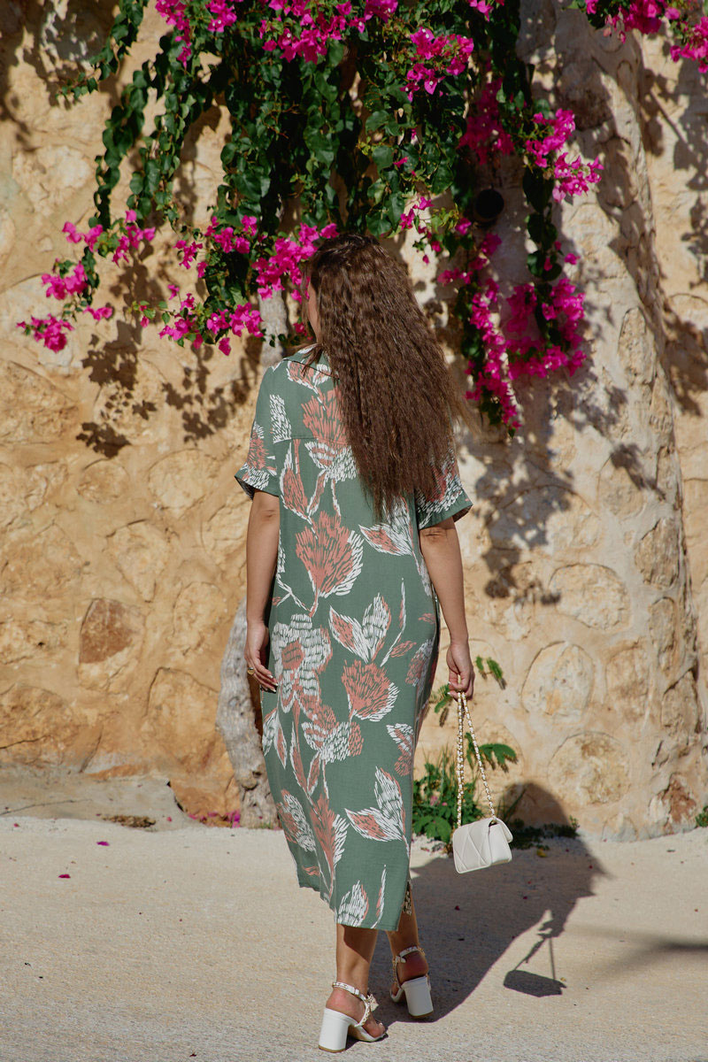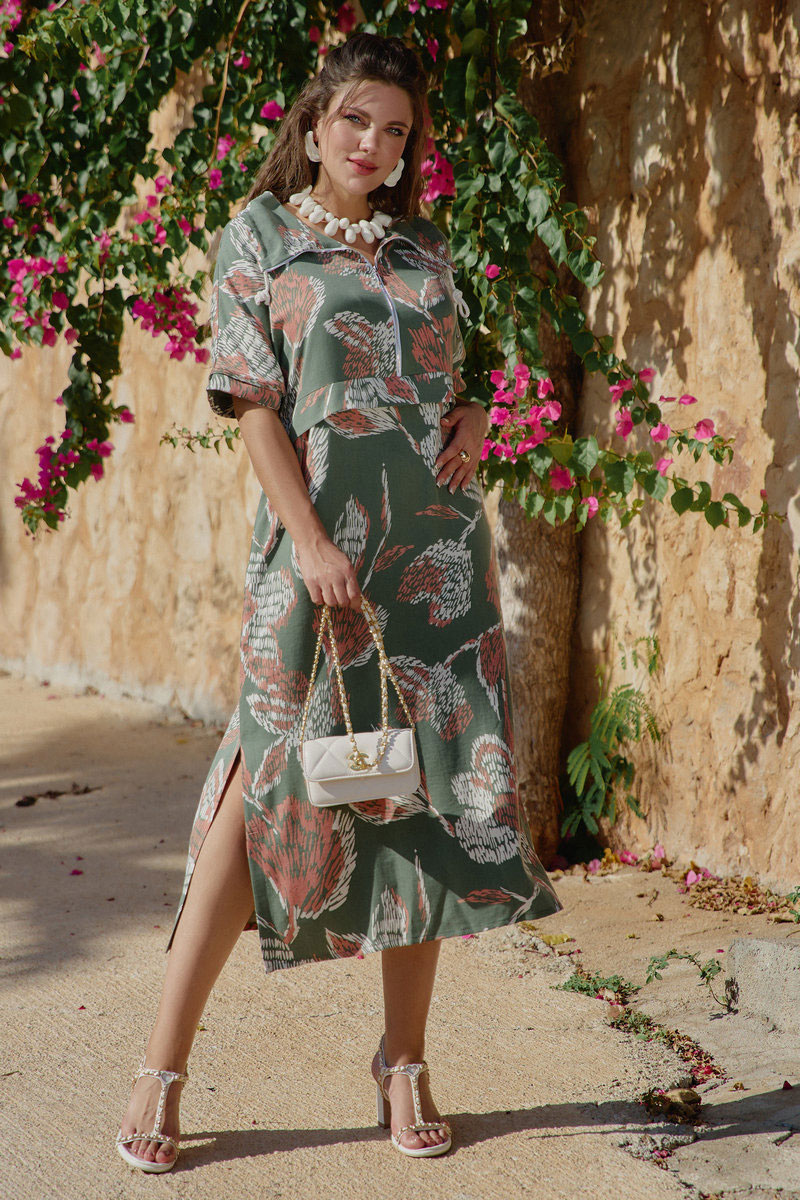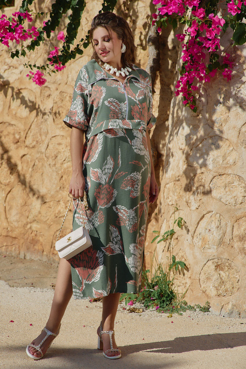 Стильное и лаконичное платье, в котором комфортно гулять даже в самую жаркую погоду, станет отличной базой в Вашем гардеробе, а ненавязчивыйй принт изделия будет притягивать к себе взгляды. Данная модель подойдёт как для похода на работу, так и для отдыха в путешествии. Платье прямого силуэта с центральной застёжкой на тесьму молнию по переду, отложным воротником с отделкой в виде декоративного шнура. По переду платья отлетная складка, в боковых швах карманы и высокие разрезы от низа. Спинка платья с отрезной кокеткой. Рукав цельнокроеный с отложной манжетой. Платье без подкладки.