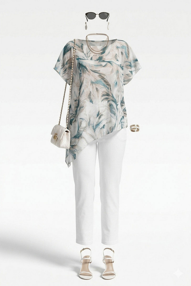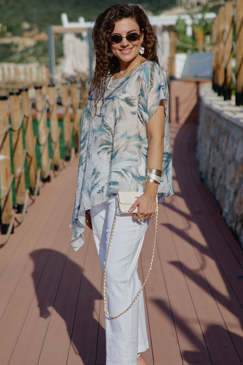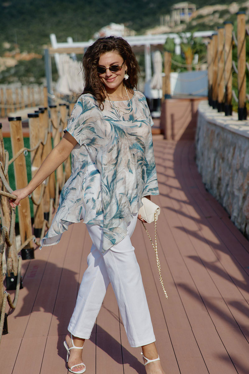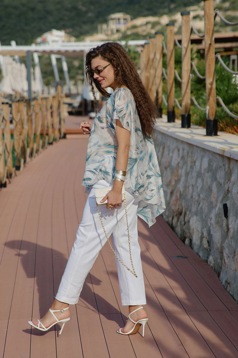 Комплект женский, двух-предметный, состоящий из блузы и брюк. В таком наряде женщина чувствует себя не просто модно, но и свободно. Невероятно стильный комплект со стильным дизайном станет ярким акцентом в вашем гардеробе! Легкий, летящий силуэт подчеркнет красоту вашей фигуры и скроет недостатки. Сочетание невесомой блузы со светлыми брюками придает образу особую изюминку. Блуза свободного силуэта с округлой формой горловины, фигурной кокеткой по переду блузы. Рукав в блузке цельнокроеный. Спинка с отрезной кокеткой. Низ в блузке ассиметричный с разрезами в боковых швах. Брюки прямого силуэта, по переду застежка на тесьму-молнию в гульфике и пуговицу в поясе. По переду наклонные карманы. В поясе брюк - вставка резинки в бочках, шлёвки. В задних половинках брюк вставка кокетки с отстрочкой и накладные карманы.