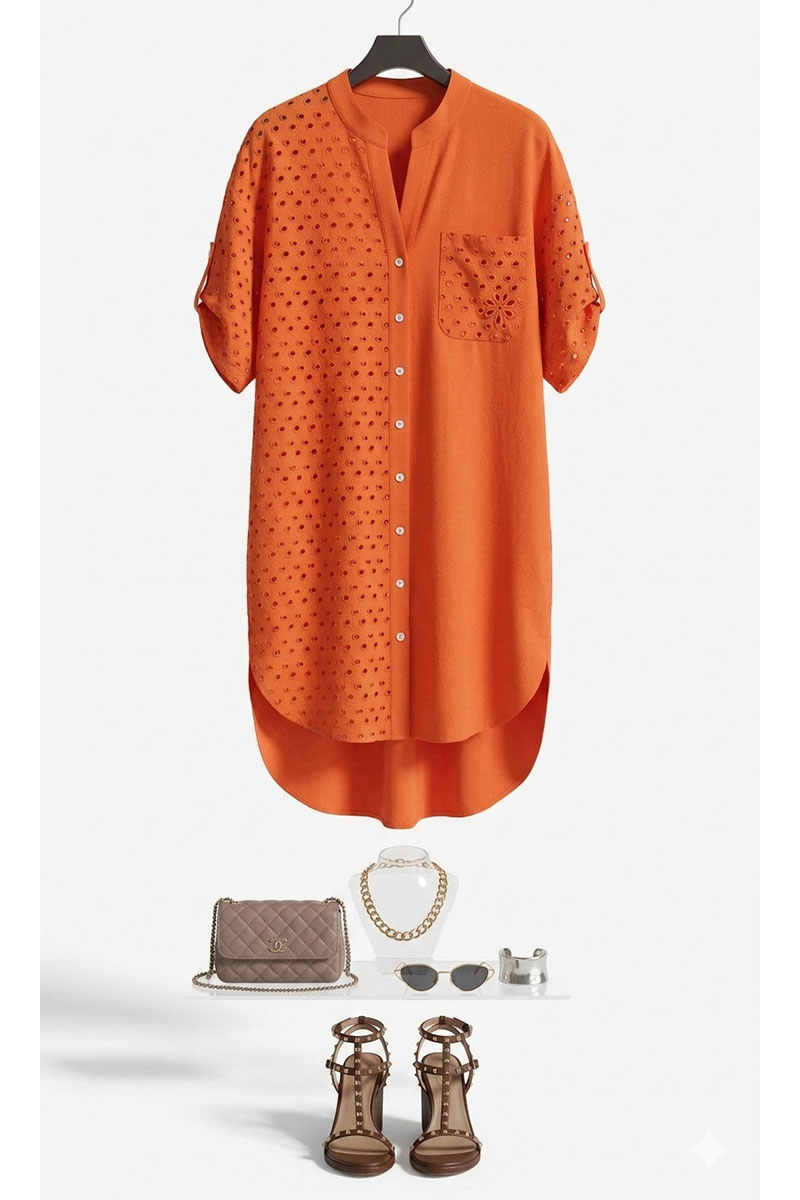 Платье-рубашка станет отличным дополнением в вашем гардеробе. Невероятно стильный комплект подчеркнет красоту вашей фигуры и скроет недостатки. Отличный вариант на лето, который так же можно стилизовать с другими вещами вашего гардероба. Платье прямого силуэта со спущенной линией плеча, округлой формой горловины, прилегающей стойкой. По переду платья центральная застёжка на петли пуговицы. Правая деталь переда платья из отделочной ткани ришелье с отрезной кокеткой «на просвет», и накладным карманом по левой детали. Спинка в платье с кокеткой из отделочной ткани – ришелье и складкой от подреза; в качестве дополнительного декоративного элемента по спинке отделка в виде пришивной нашивки. Рукав втачной с декоративной патой и пуговицей. Низ в платье ассиметричный, в боковых швах платья карманы.
