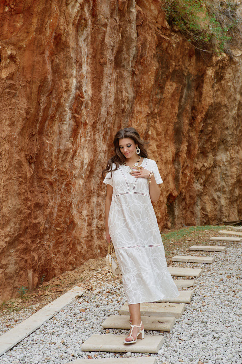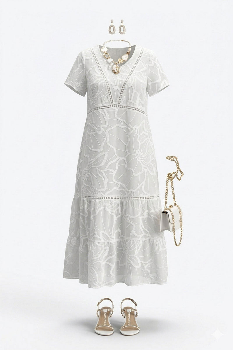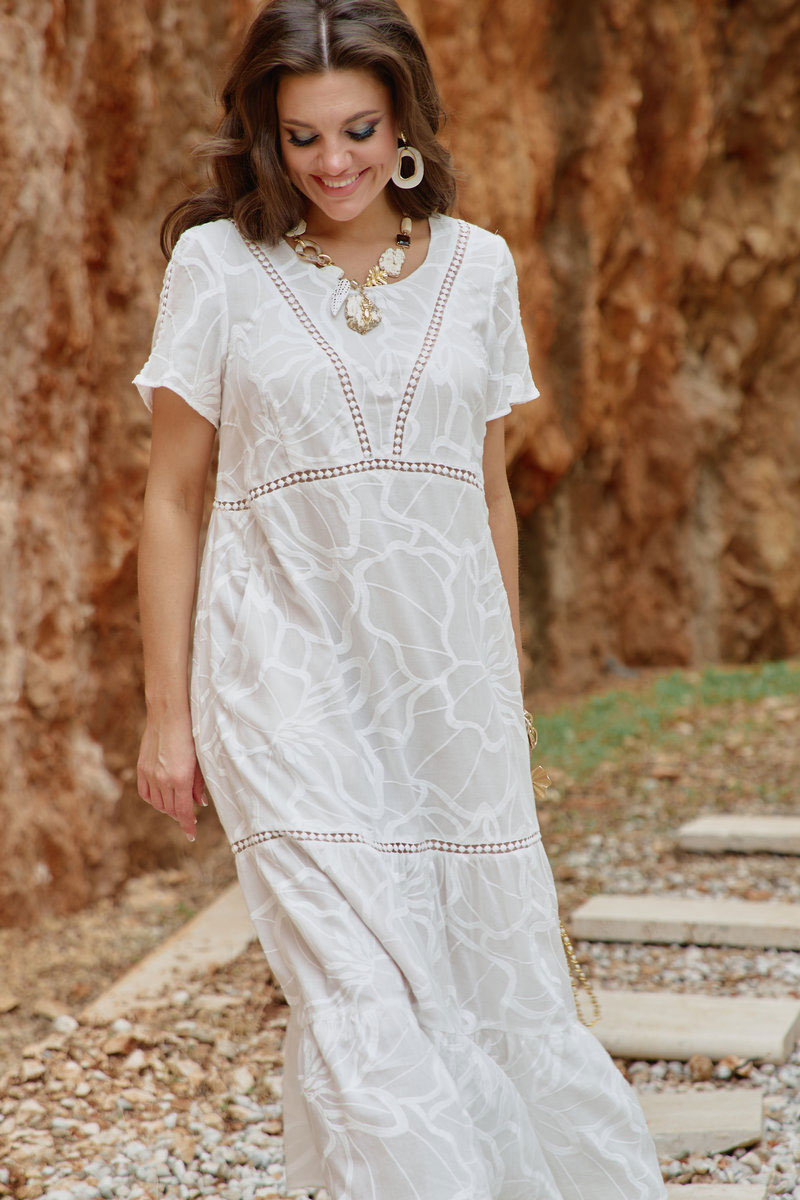 Каждая деталь этого платья пронизана нежностью и шармом. Платье позволяет каждой женщине, носившей его, ощущать себя неотразимой. Оно является идеальным выбором для летних встреч, прогулок по берегу моря или романтических свиданий в парке. Украсит любую фигурку, а вставки из кружева добавят образу романтики. Платье, расклешённое к низу, на подкладке. По переду расположены конструктивные вытачки и фигурная вставка с намёком на декольте на лифе с декоративным кружевом, округлый подрез на завышенной талии с кружевной тесьмой, в нижней части расположены удобные карманы, горизонтальный подрез с кружевной тесьмой и воланы. По спинке в верхней части расположен средний шов с обработанной застёжкой на навесную петлю с пуговицей, горизонтальные подрезы с кружевной тесьмой и воланы. Рукав втачной с вертикальной вставкой из кружевной тесьмы.