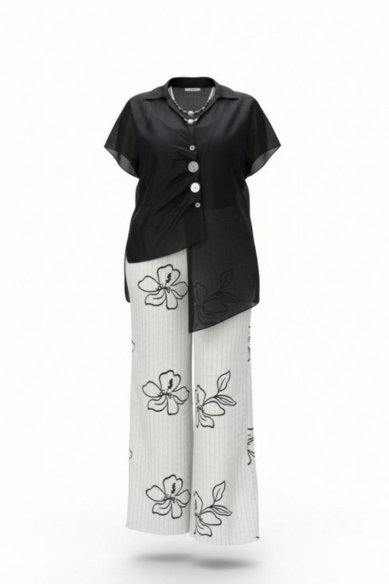 Брюки прямого силуэта, с притачным поясом со вставкой эластичной тесьмы-резинки в бочках, застёжкой на тесьму-молнию в гульфике и пуговицу в поясе. В боковых швах брюк прорезные карманы. Черные полоски плавно в сочетании с цветочными узорами добавляют в комплект легкость и игривость, превращая его в настоящее произведение искусства. Брюки на подкладке. Обращаем Ваше внимание, что фурнитура может незначительно отличаться от фото.