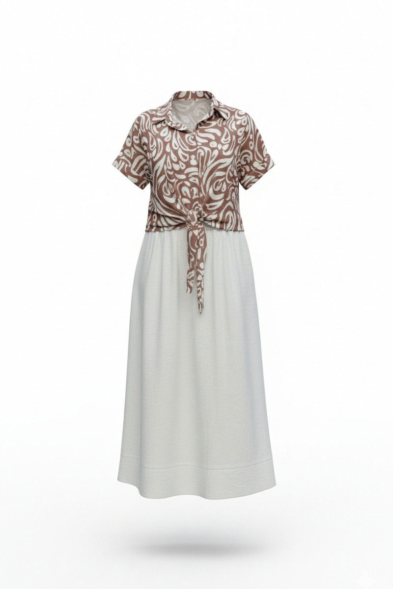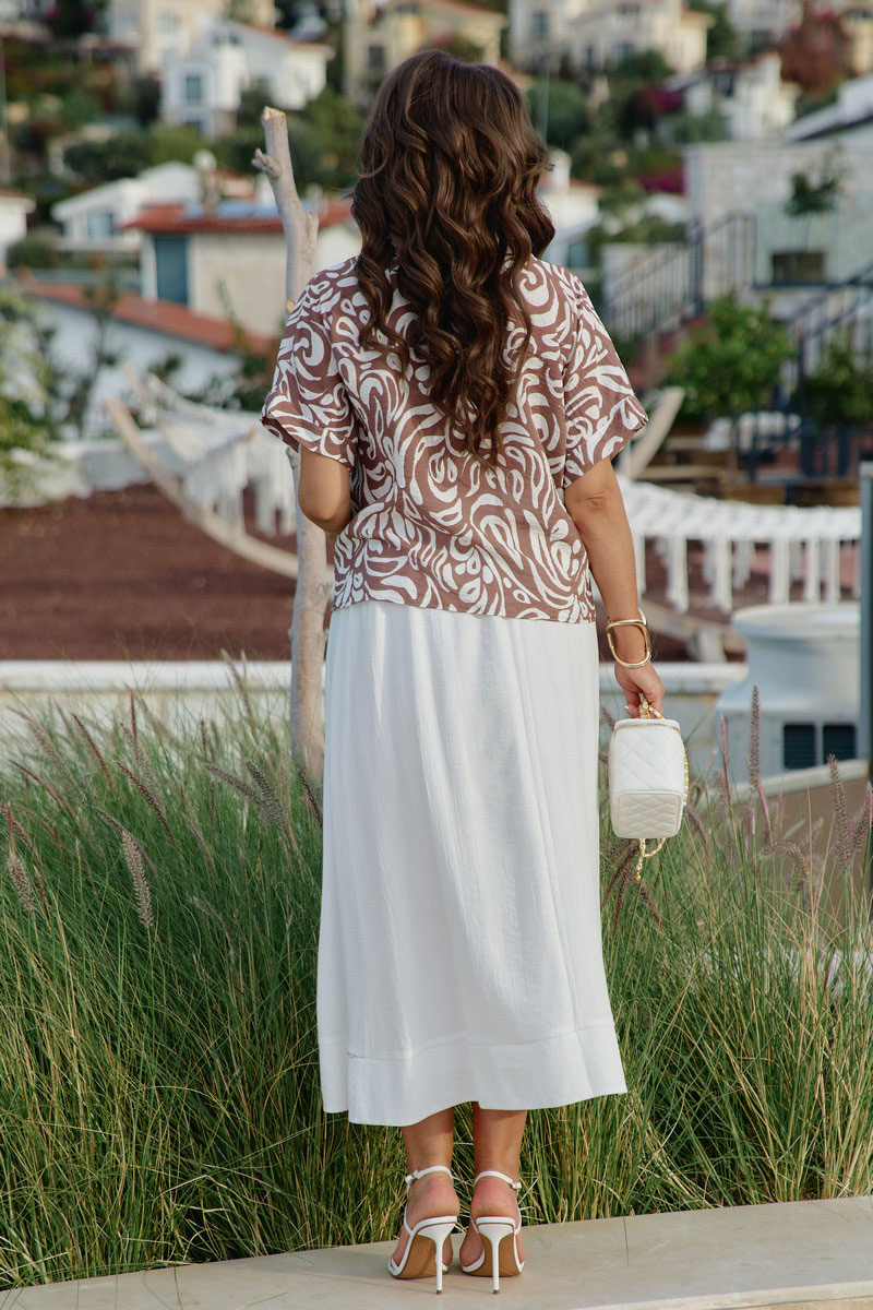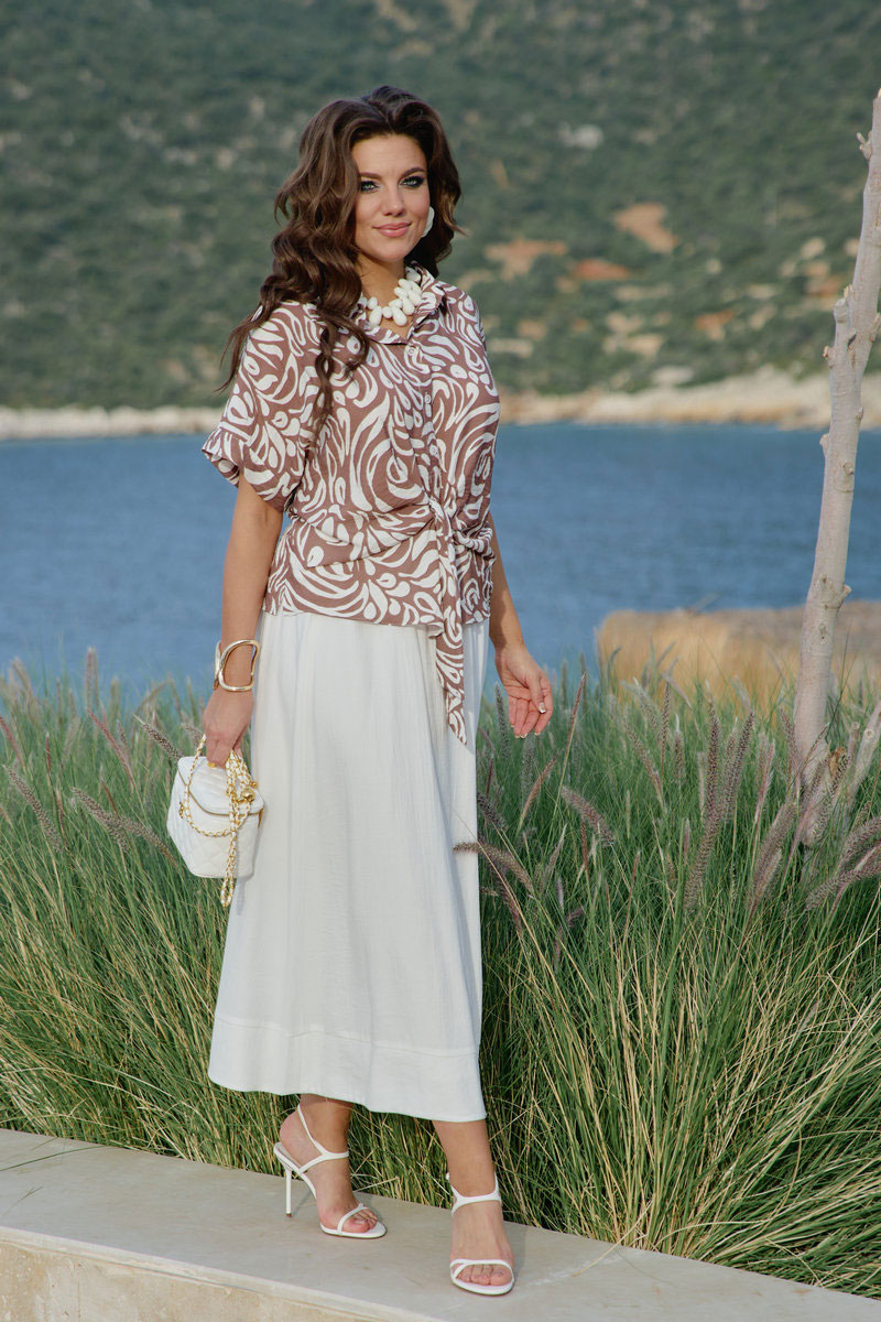 Блузка женская из ткани в принт создаёт образ одновременно романтичный и утонченный. Ткань достаточно плотная, чтобы держать форму, но при этом легкая, чтобы не стеснять движения. Блузка с центральной застёжкой на декоративные петли-пуговицы по планке, с воротником рубашечного типа. Её свободный крой обволакивает фигуру, не стесняя, а подчёркивая её естественные линии. Рукав в блузке цельнокроеный с притачной манжетой по низу. По переду блузки цельнокроеные отрезные детали завязывающиеся на бант. Спинка с отрезной кокеткой. В боковых швах блузки разрезы.