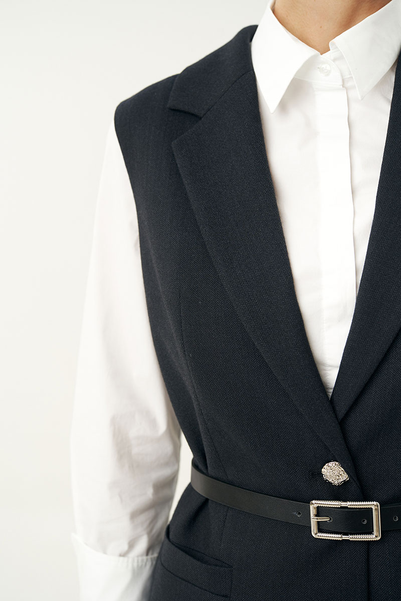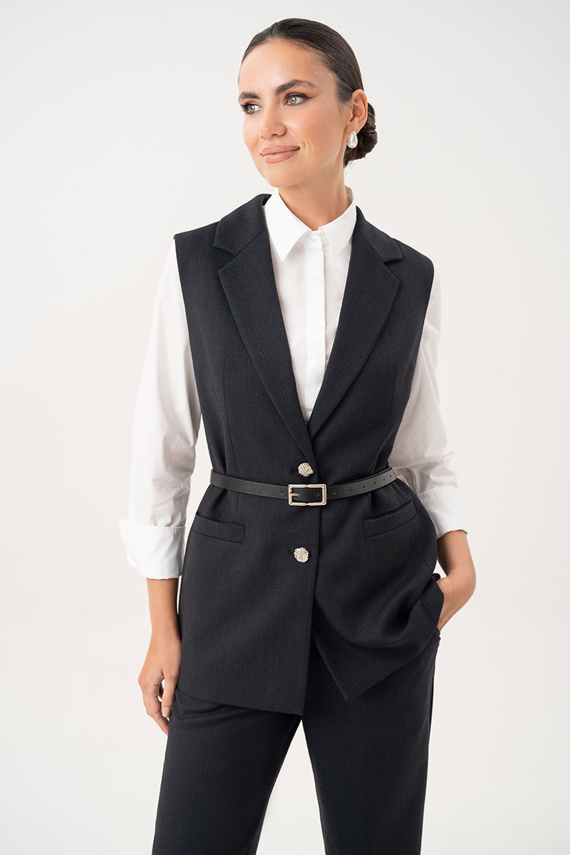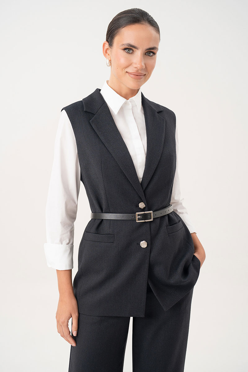 повседневной носки. Костюм состоит из жилета на подкладке полуприлегающего силуэта и прямых брюк, в комплект к костюму идет ремень (фурнитура на изделии может незначительно отличаться