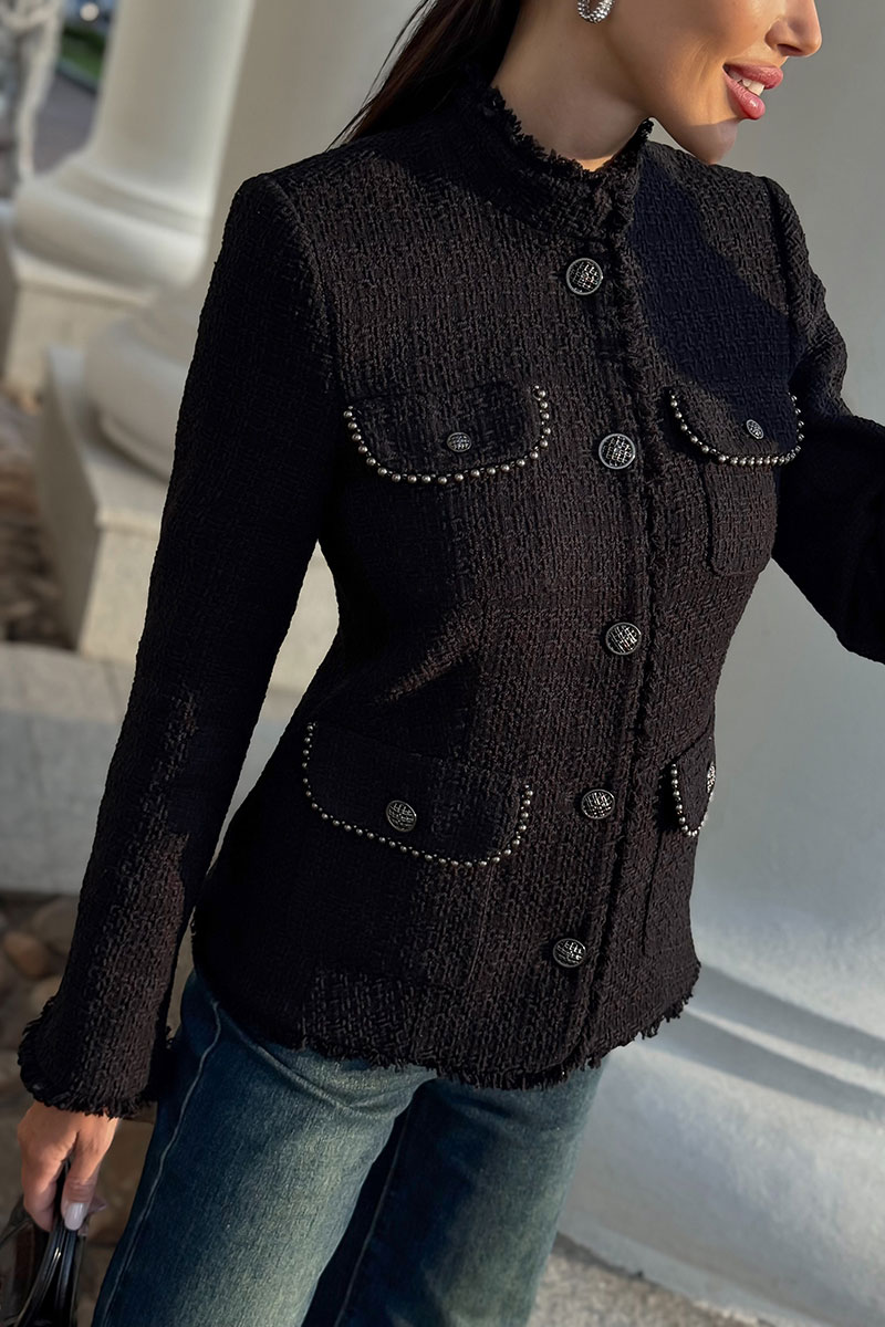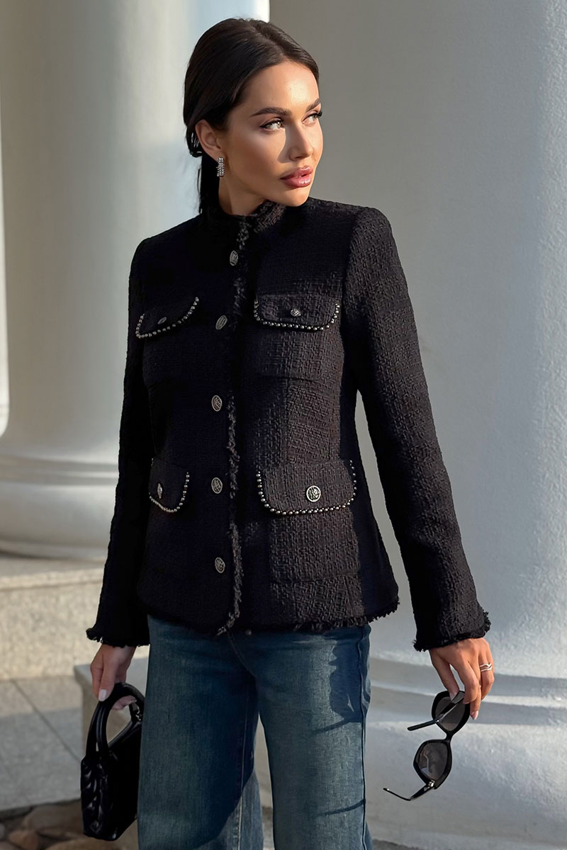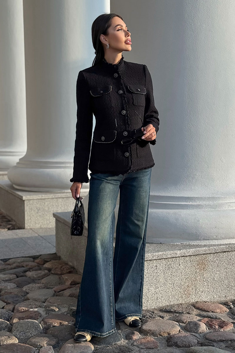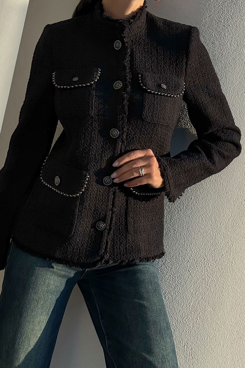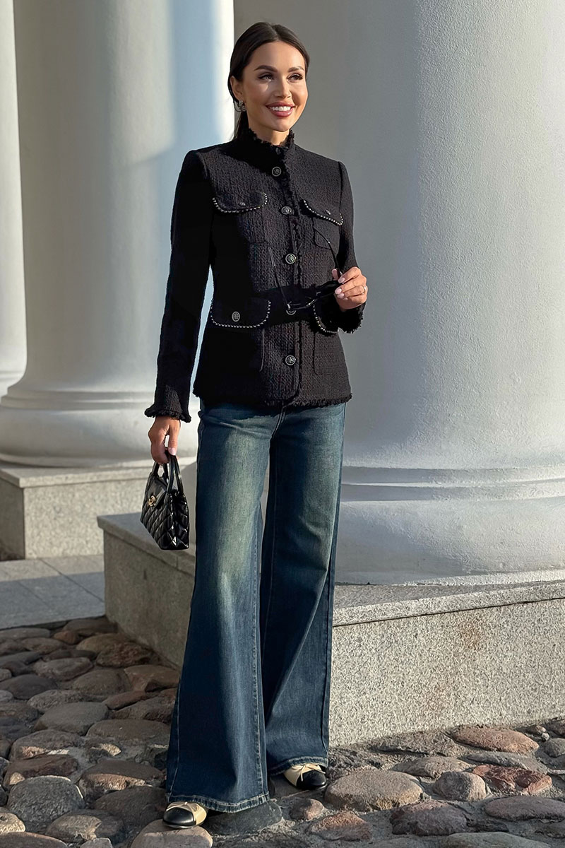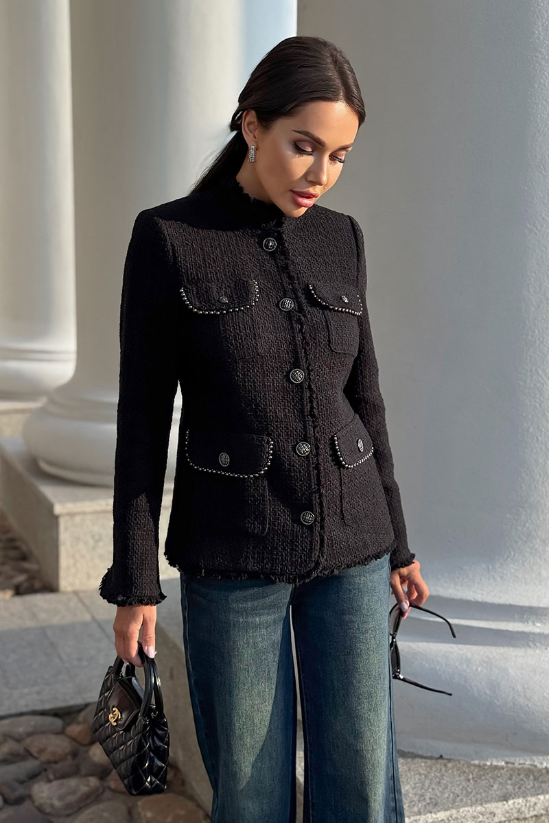 Этот жакет в стиле Шанель выполнен из черного твида, что придает ему особый шарм и элегантность. Красивая отделка и фурнитура дополняют образ, делая его еще более изысканным. Жакет идеально подойдет для создания строгого, но в то же время женственного образа. Он прекрасно сочетается с платьями и юбками, а также с джинсами и брюками. Благодаря качественным материалам и мастерству исполнения, жакет сохранит свою форму и внешний вид на долгое время. В этом жакете вы будете выглядеть стильно и уверенно в любой ситуации.