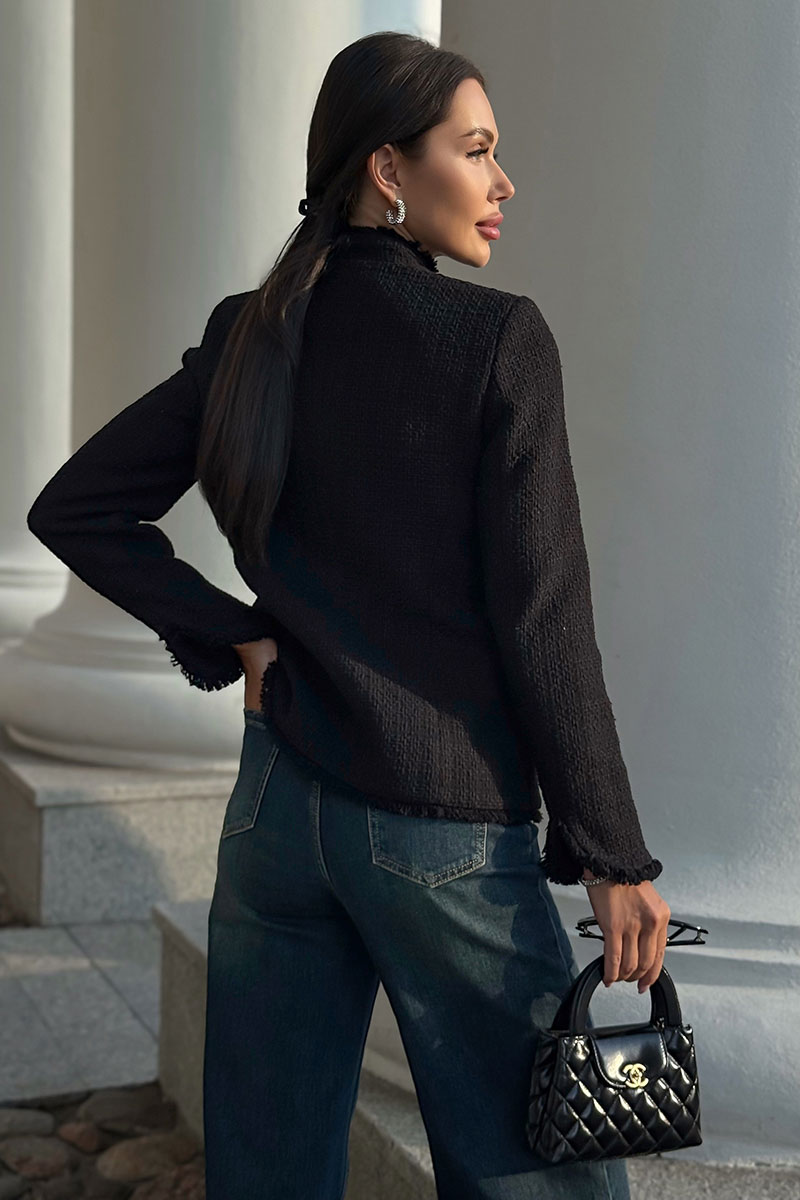 По низу рукавов, борту жакета, низу и стойке идет отделка бахромой.