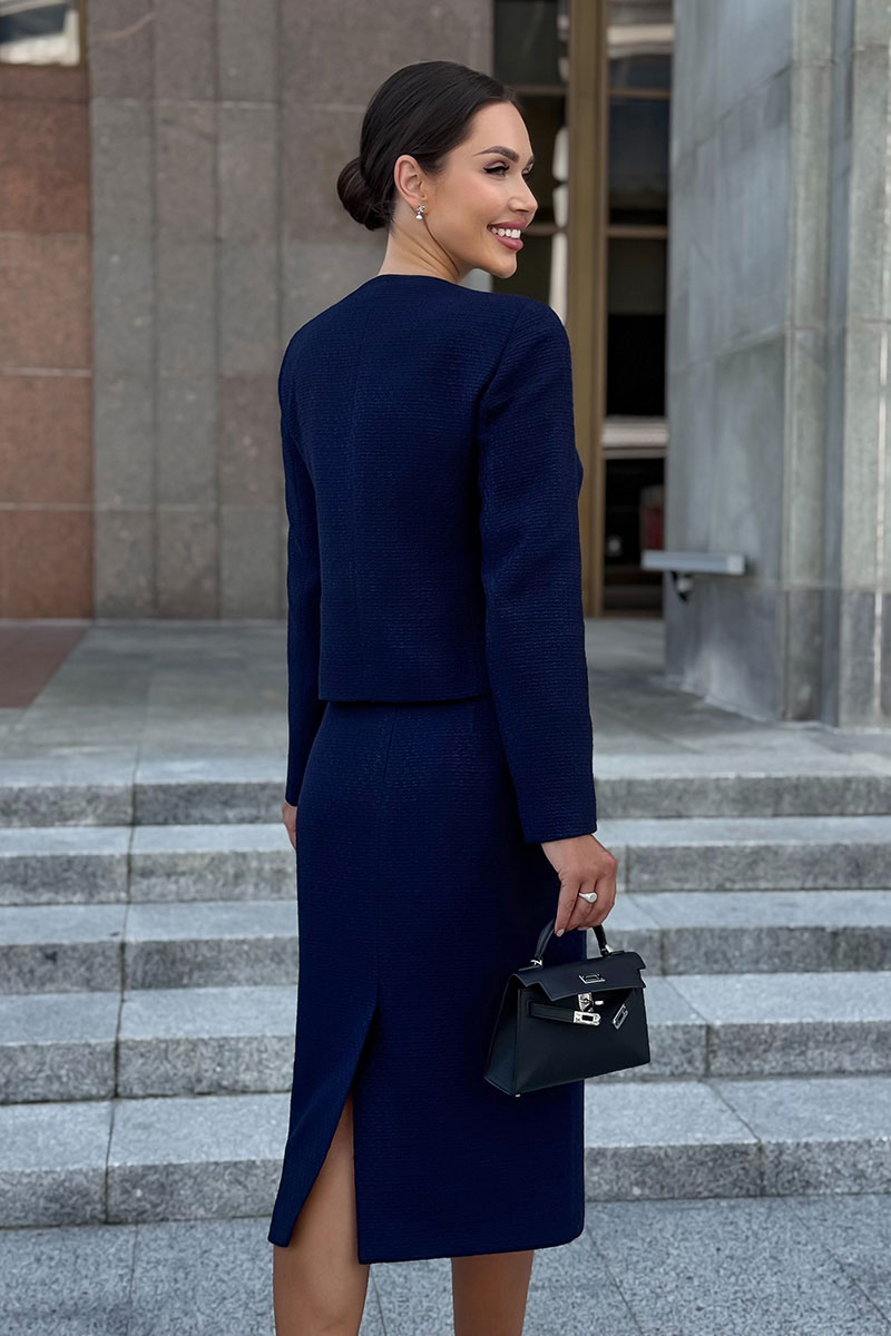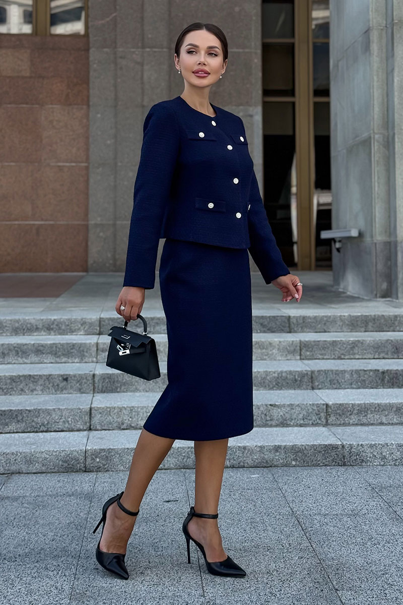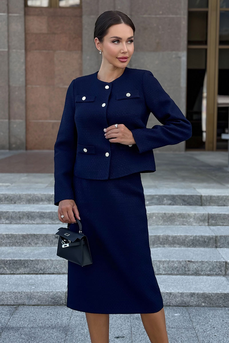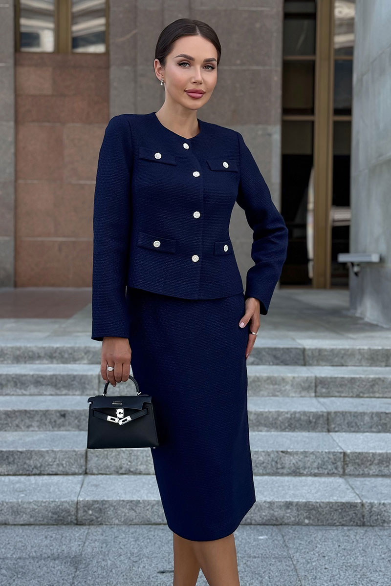 выполненных в изысканном синем цвете. Такой ансамбль подчеркивает женственность и подходит для строгого дресс-кода, деловых встреч и торжественных событий. Костюм женский 2-х