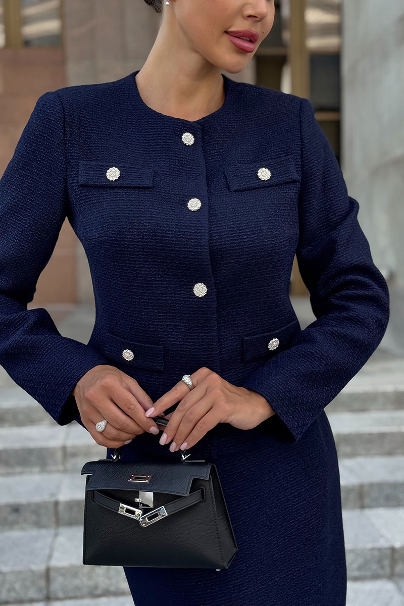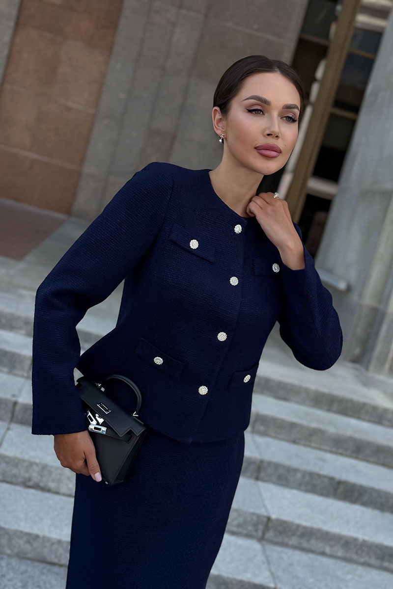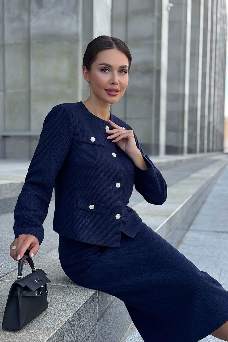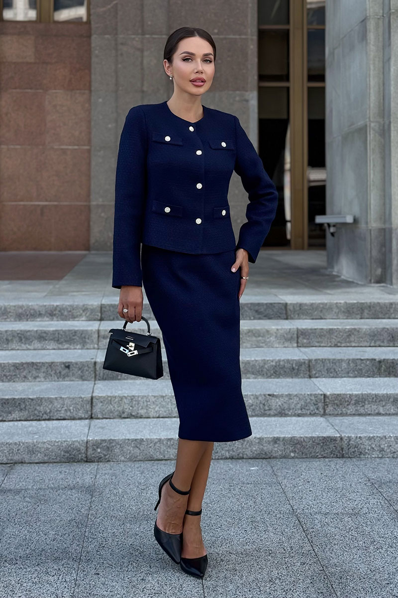 выполненных в изысканном синем цвете. Такой ансамбль подчеркивает женственность и подходит для строгого дресс-кода, деловых встреч и торжественных событий. Костюм женский 2-х