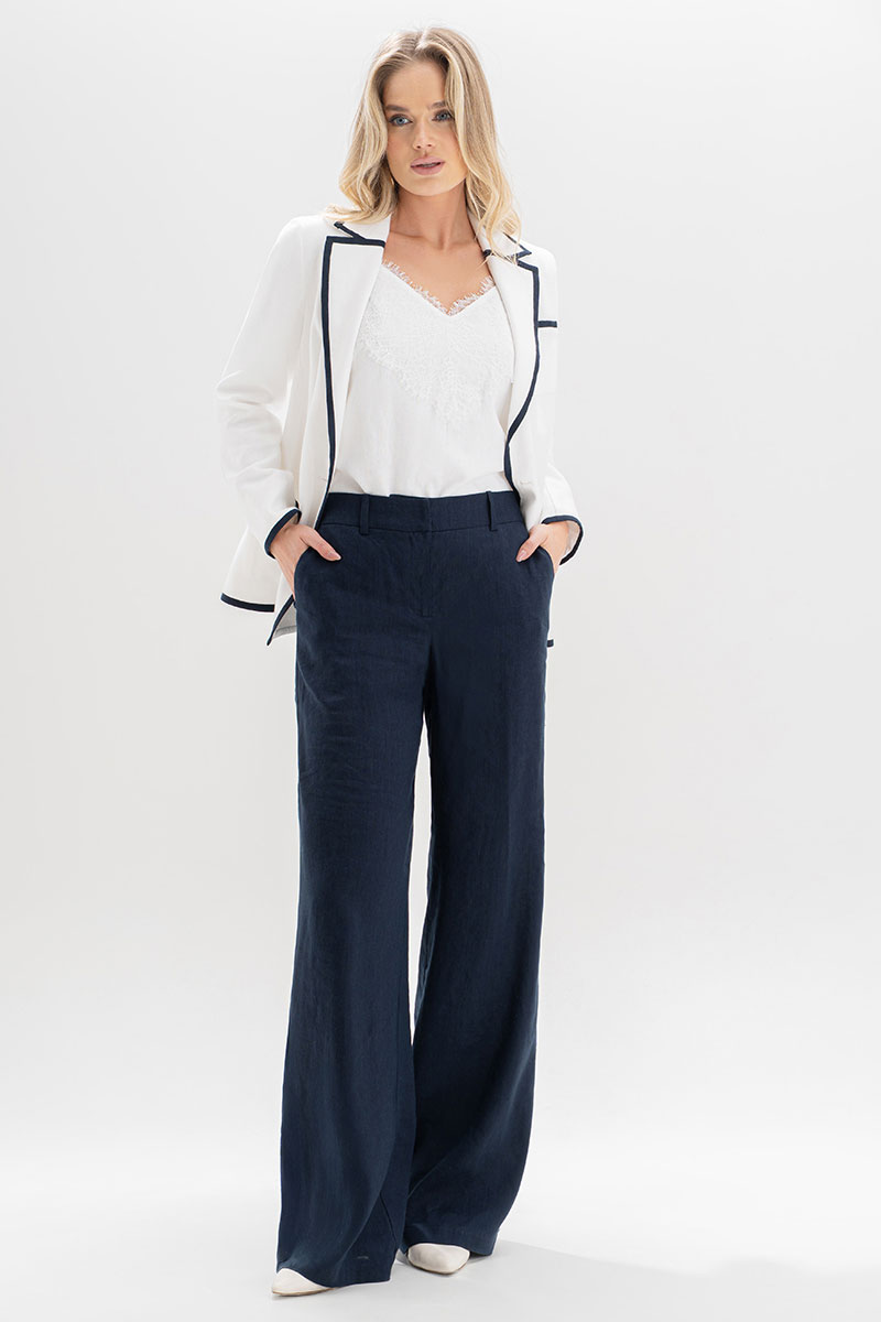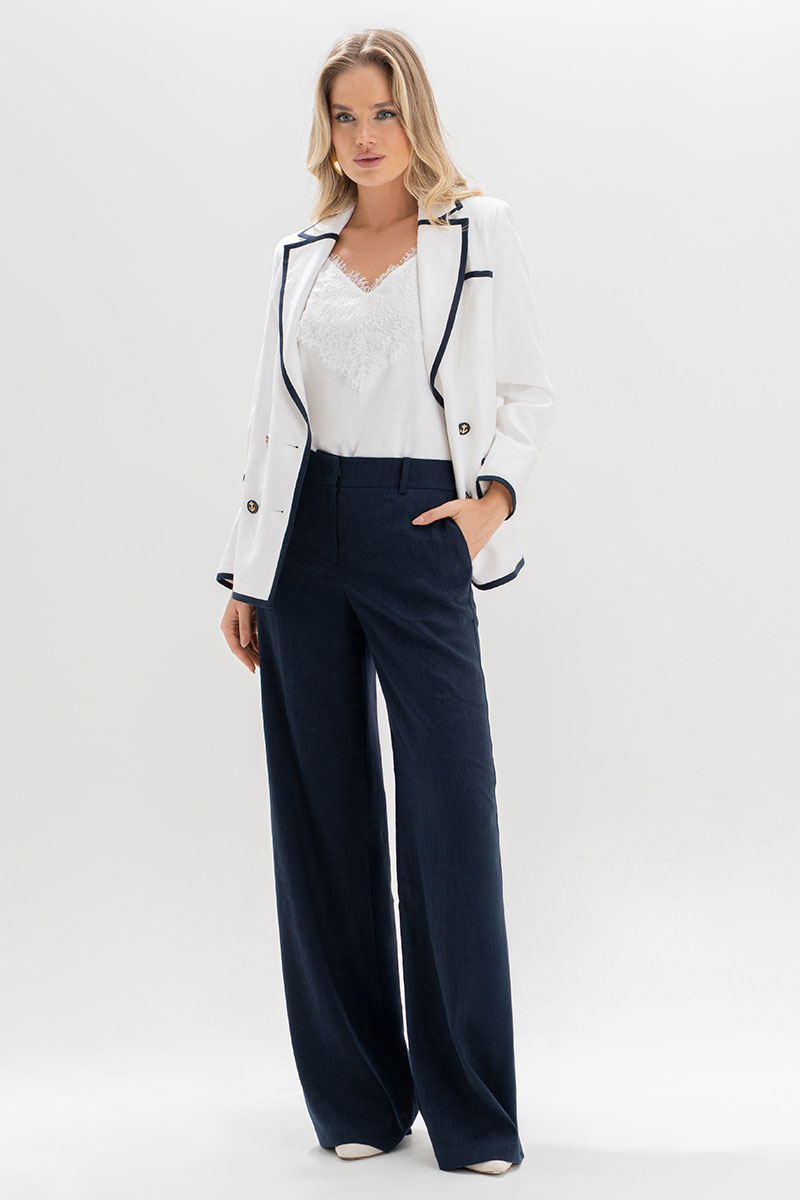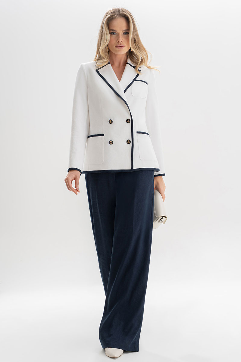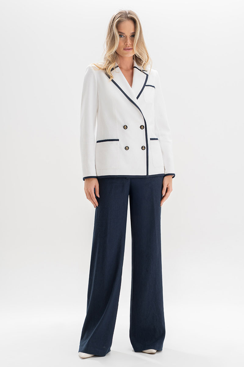 Этот костюм изо льна — воплощение утончённости и сдержанного шика. Двубортный жакет с акцентной тёмно-синей окантовкой подчёркивает силуэт и добавляет графичности образу. Золотые пуговицы с якорями придают ансамблю характерный морской шарм, создавая отсылку к стилю яхт-клубов и Средиземноморскому лету.⠀Этот костюм гармонично сочетает классику и современность, подойдёт как для деловых встреч, так и для стильных выходов на отдыхе у моря.