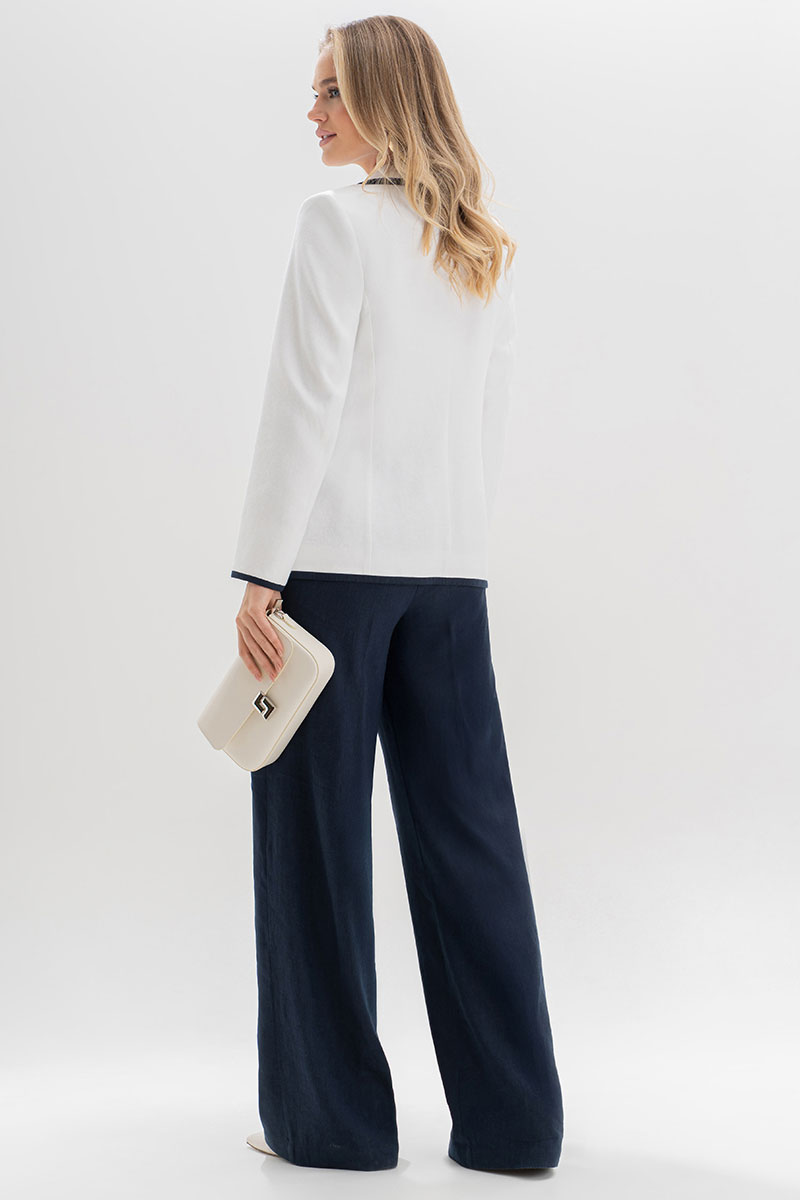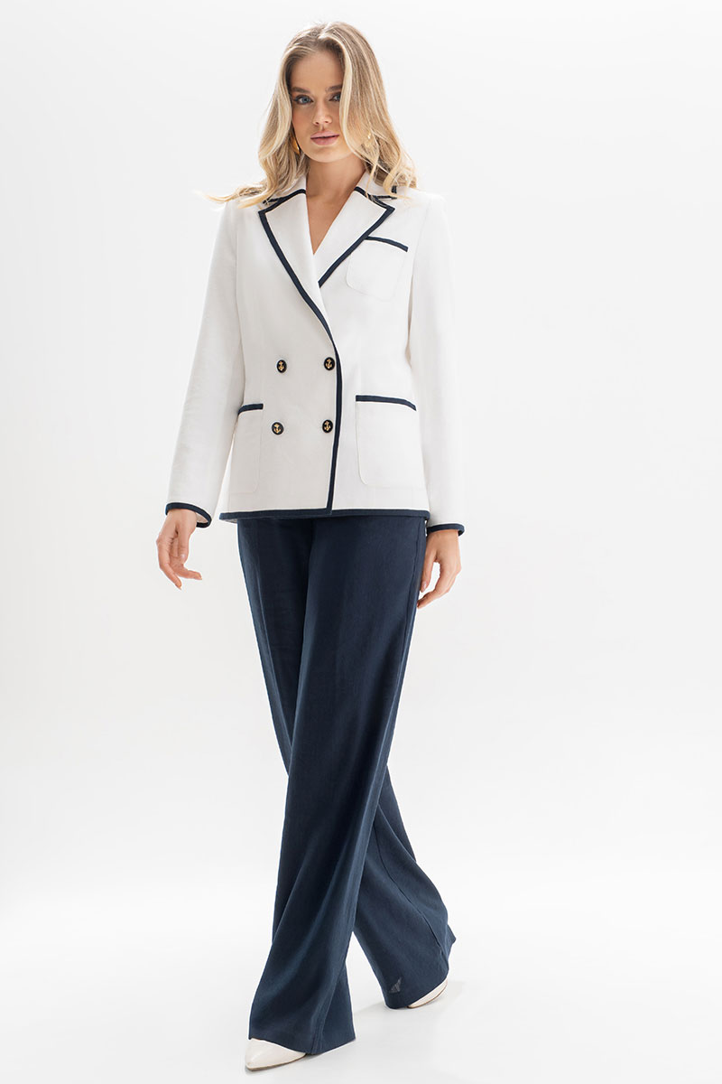 Жакет женский, полуприлегающего силуэта, выполнен из молочного льна, на подкладке, с двубортной застежкой на 2 петли, 4 декоративные (размер и цвет фурнитуры может незначительно отличаться от фото). Перед и спинка с цельнокроеным отрезным бочком. Перед с нагрудными вытачками, переходящими в подрезы от рельефных швов бочка, в левой верхней и в нижних частях с накладными карманами с закругленными углами. Спинка со средним швом, с рельефными швами бочка, идущими от пройм до низа. Горловина оформлена воротником пиджачного типа. Рукава втачные, двухшовные, длинные. Воротник, лацканы, борта, верх карманов, низа рукавов, низа переда и спинки обработаны притачными планками выполненными из темно-синего льна. Жакет с плечевыми накладками.