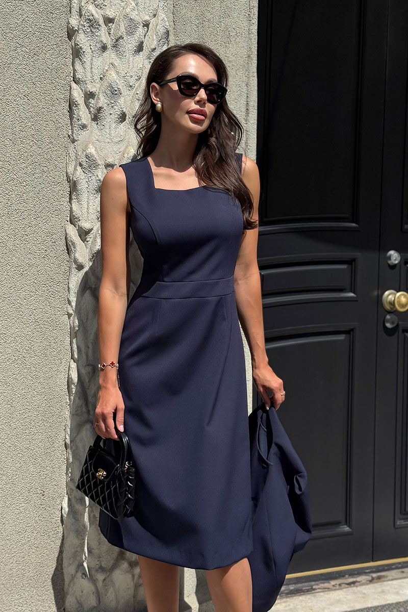 Платье женское полуприлегающего силуэта, слегка расширенное к низу, отрезное по линии талии с притачным поясом, без рукавов, на отлетной по низу подкладке. Верхняя часть переда с рельефными швами, проходящими через центр груди и идущими из пройм, вниз до пояса. Верхняя часть спинки с рельефными швами, идущими из пройм, вниз до пояса.