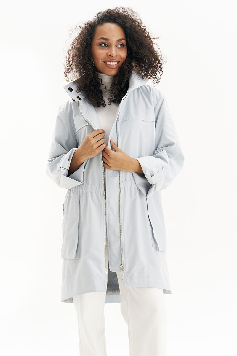 Куртка женская прямого силуэта, из плащевой ткани, на подкладке, с центральной бортовой застежкой на металлическую тесьму - «молнию» (размер и цвет фурнитуры может незначительно отличаться от фото), для повседневной носки. Перед с настрочной с изнанки кулисой с резинкой на уровне талии. На нижней части переда настрочены накладные объёмные карманы, застегивающиеся на металлическую тесьму - «молнию». На верхней части переда и спинки обработаны отлетные горизонтальные отлетные планки шириной 4,0 см. Левая часть переда с внутренней ветрозащитной планкой. Рукава втачные, двухшовные, длинные. Верхний шов рукава с пришивной кнопкой. Низ рукава может застёгиваться на хлястик с пришивной потайной кнопкой, тем самым укорачивается длина рукава до 7/8. Горловина обработана широким воротником стойкой, со смещённой относительно центра переда застёжкой на 2 потайные пришивные кнопки. Так же на верхнем воротнике обработан карман, застёгивающийся на металлическую тесьму - «молнию», в котором прячется капюшон. Низ куртки обтачной, перед незначительно короче спинки. По низу куртки прострочена отделочная строчка шириной 3,5см.