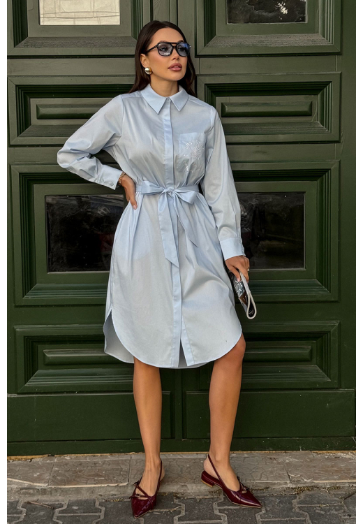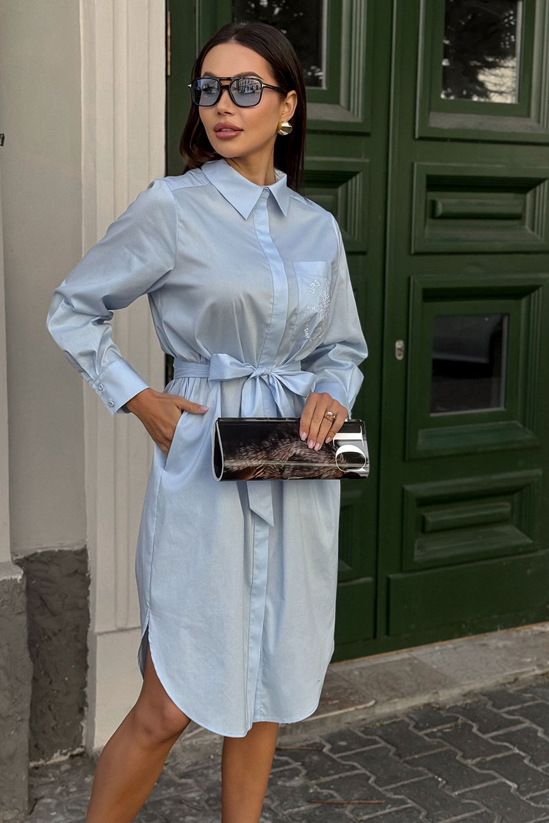 Элегантное голубое платье-рубашка с поясом и вышивкой на нагрудном кармане — идеальный выбор для повседневного и офисного образа. Модель выполнена из качественной костюмной ткани, приятной к телу, сдержанно сияющей на солнце. Благодаря прямому силуэту и акценту на талии за счёт пояса, платье выгодно подчеркивает фигуру и подходит для любого типа телосложения.