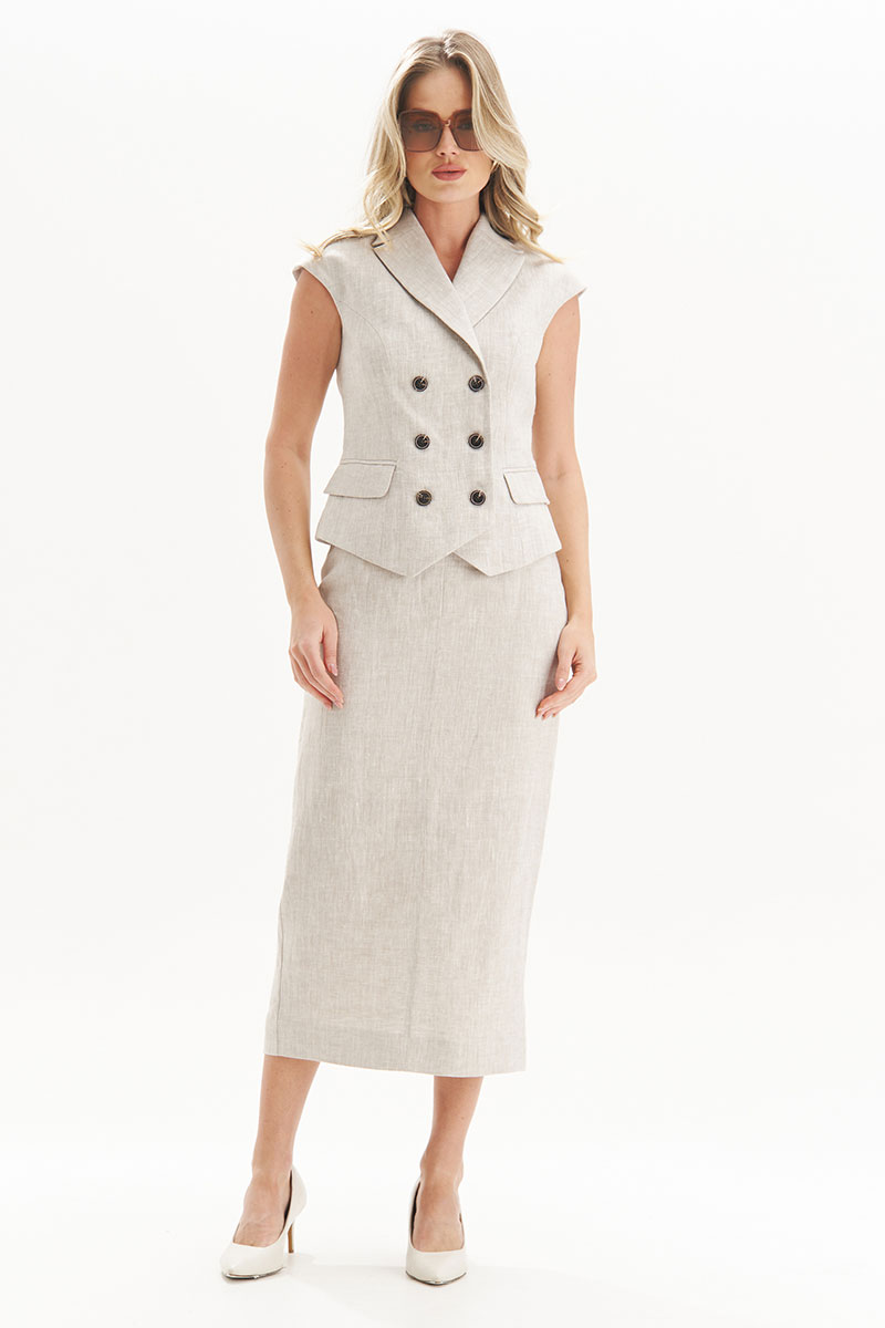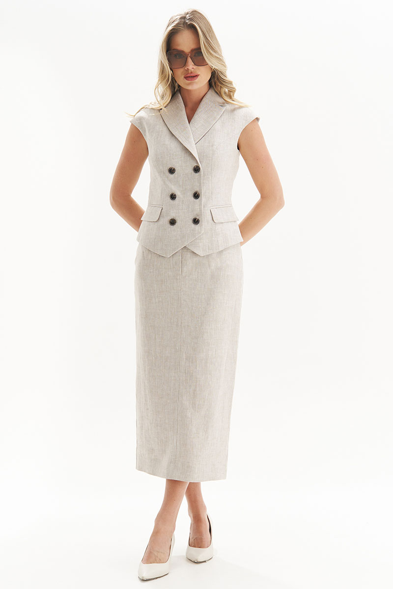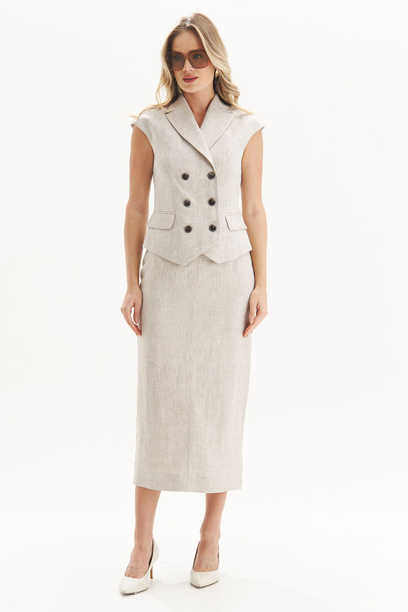Элегантный костюм из натурального льна — идеальный выбор для теплого сезона. Комплект состоит из приталенного жилета с эффектной двубортной застежкой и прямой юбки миди-длины. Лёгкий