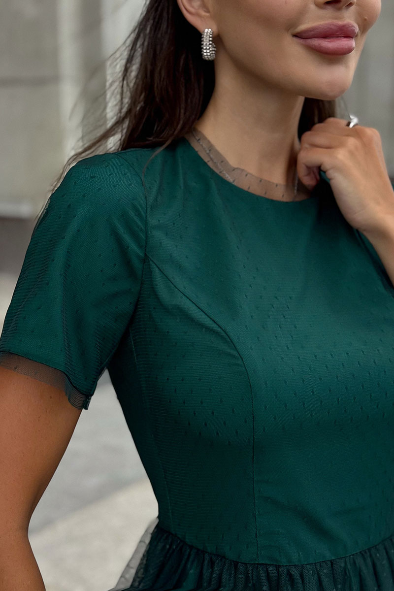 Нижняя часть переда и спинки (юбка) расклешенная к низу, двухслойная: нижний слой из плательной ткани, верхний слой из сетки, по срезу талии собранный на сборку.