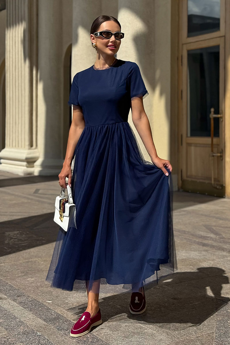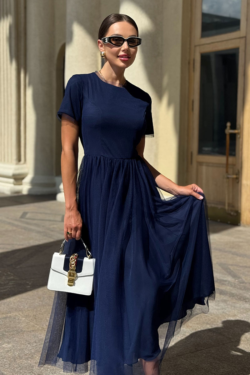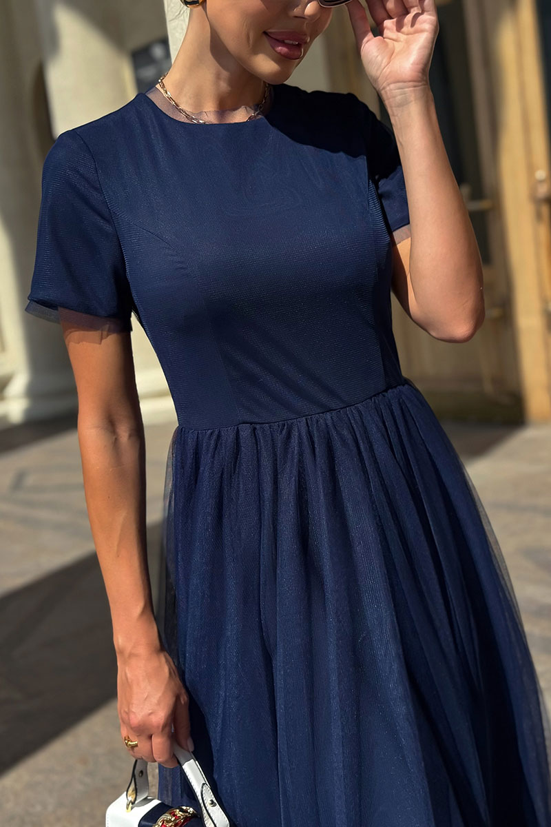 Нижняя часть переда и спинки (юбка) расклешенная к низу, двухслойная: нижний слой из плательной ткани, верхний слой из сетки, по срезу талии собранный на сборку.