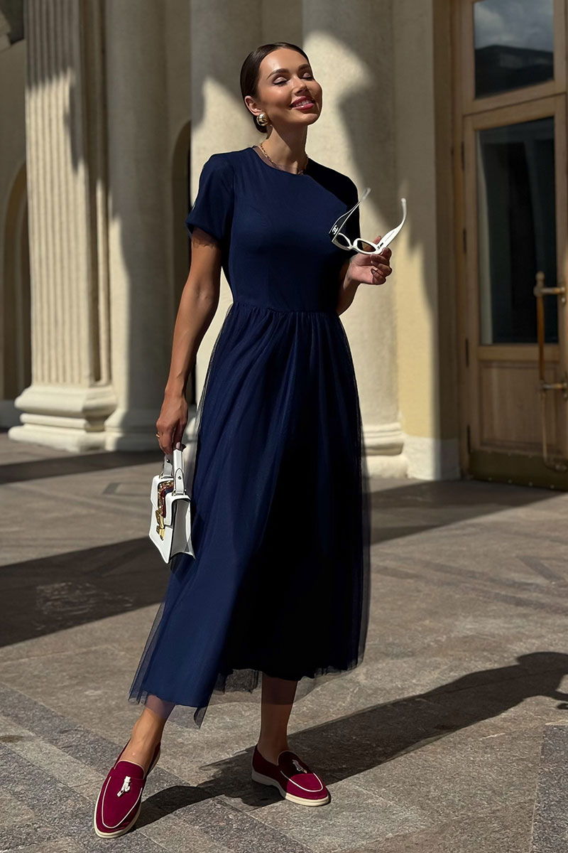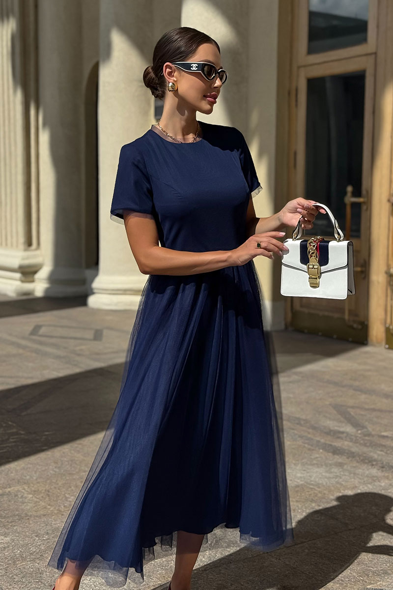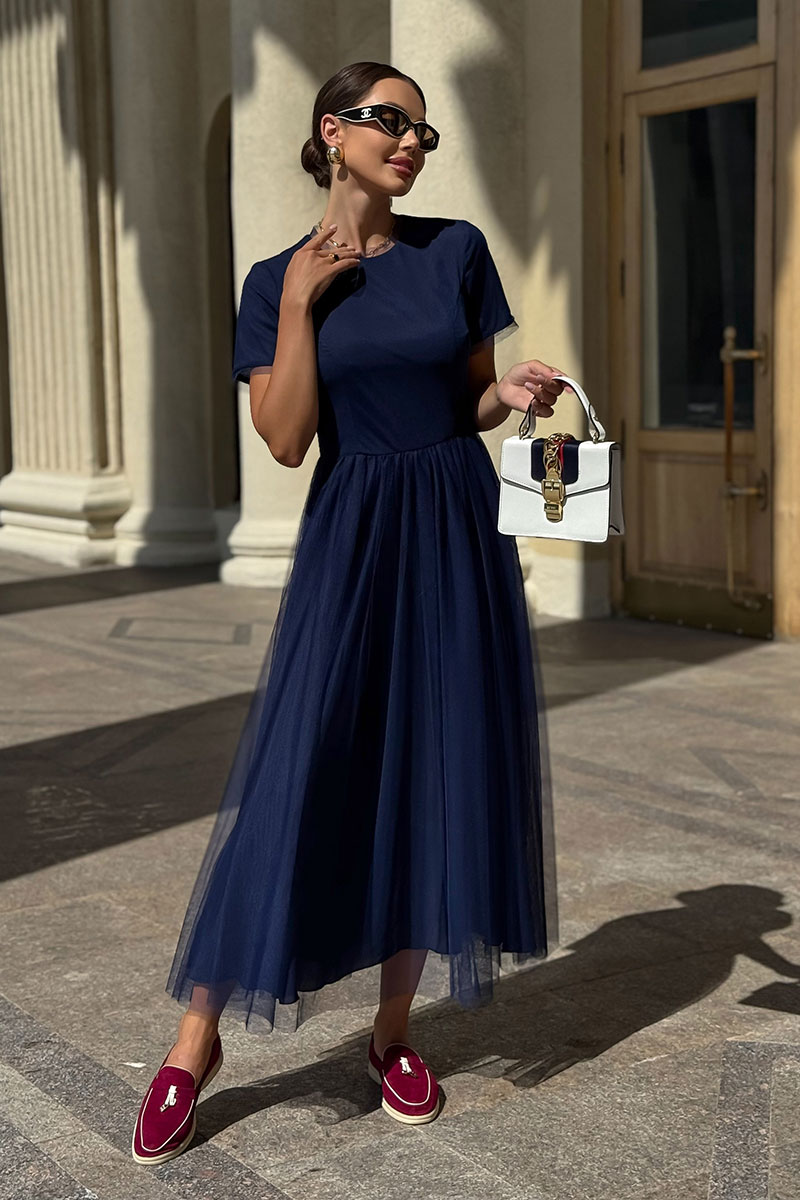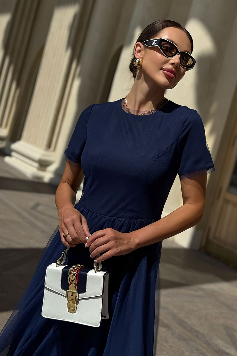 Нижняя часть переда и спинки (юбка) расклешенная к низу, двухслойная: нижний слой из плательной ткани, верхний слой из сетки, по срезу талии собранный на сборку.