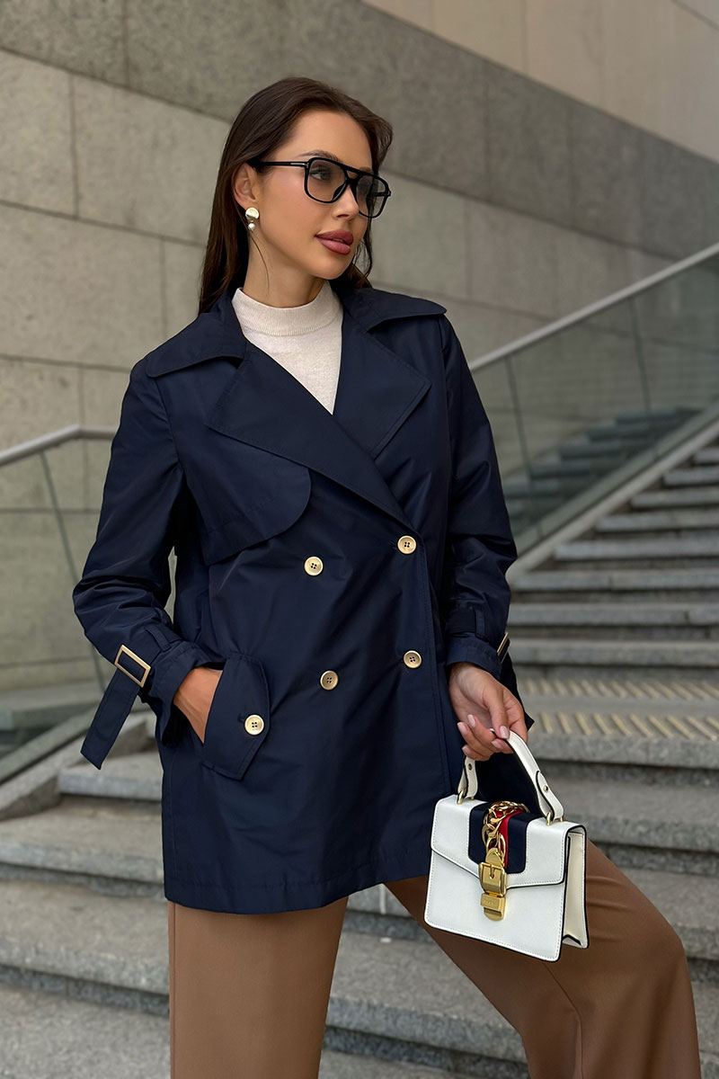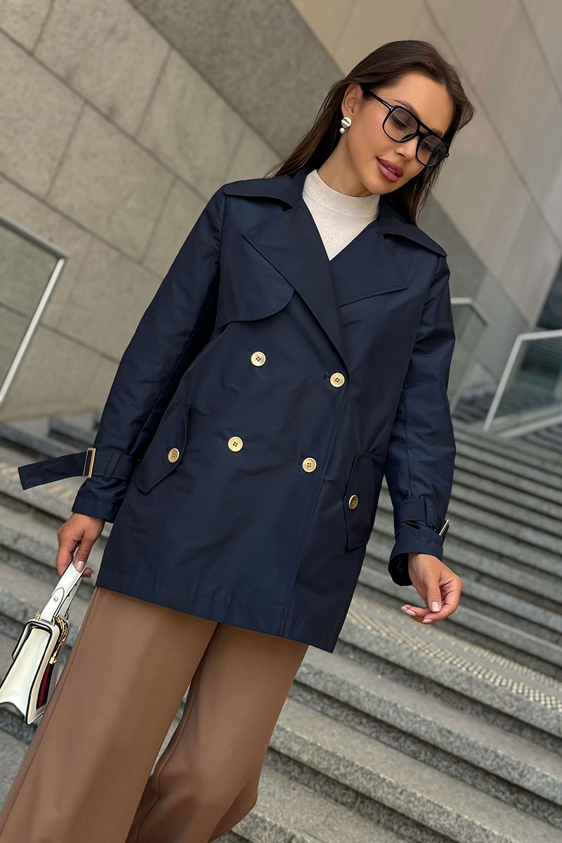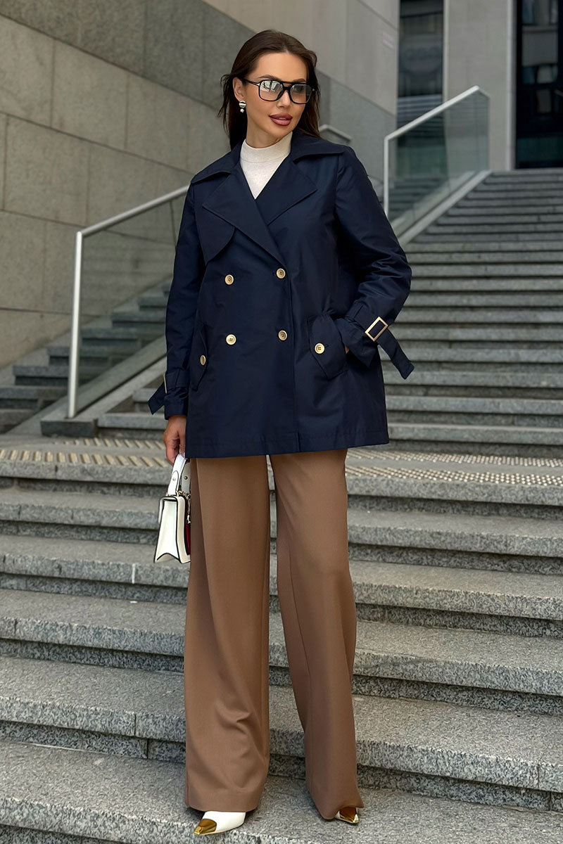 Дизайн с двубортной застёжкой, аккуратными лацканами и декоративными пуговицами подчеркивает классику, а современные детали — кокетки и пряжки на рукавах — добавляют модный акцент.