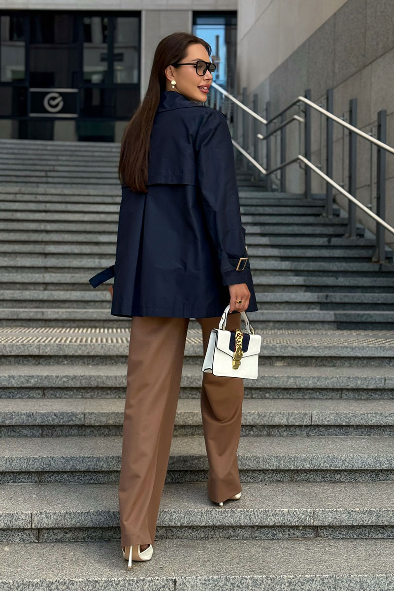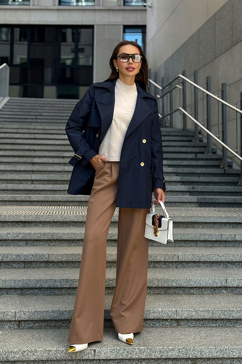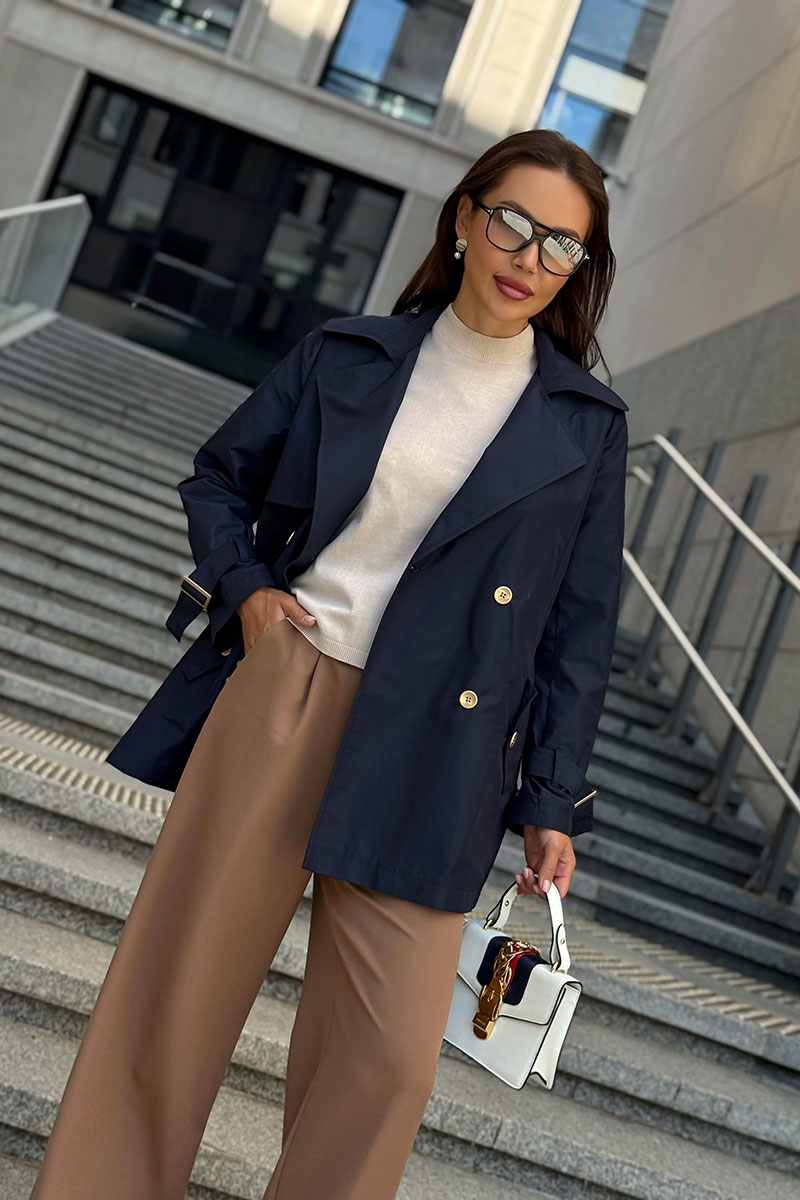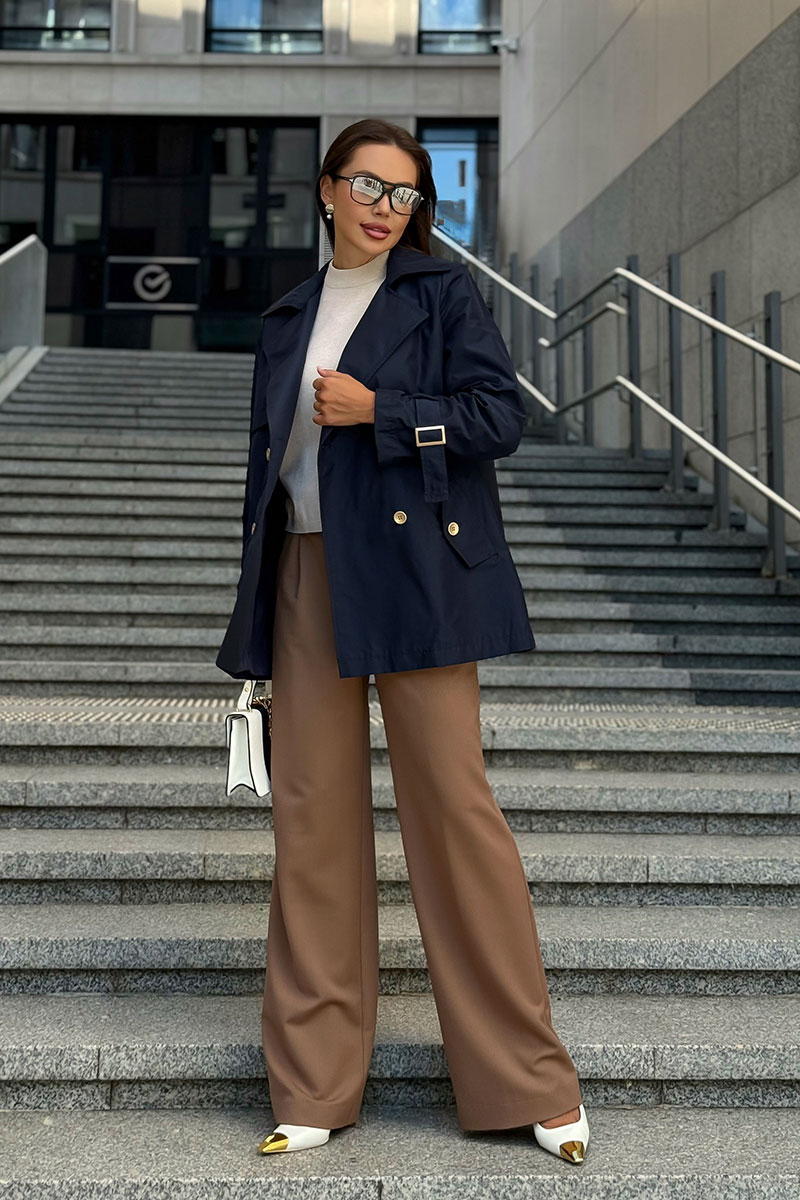 Дизайн с двубортной застёжкой, аккуратными лацканами и декоративными пуговицами подчеркивает классику, а современные детали — кокетки и пряжки на рукавах — добавляют модный акцент.
