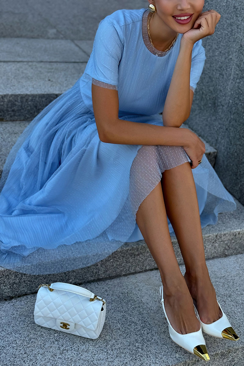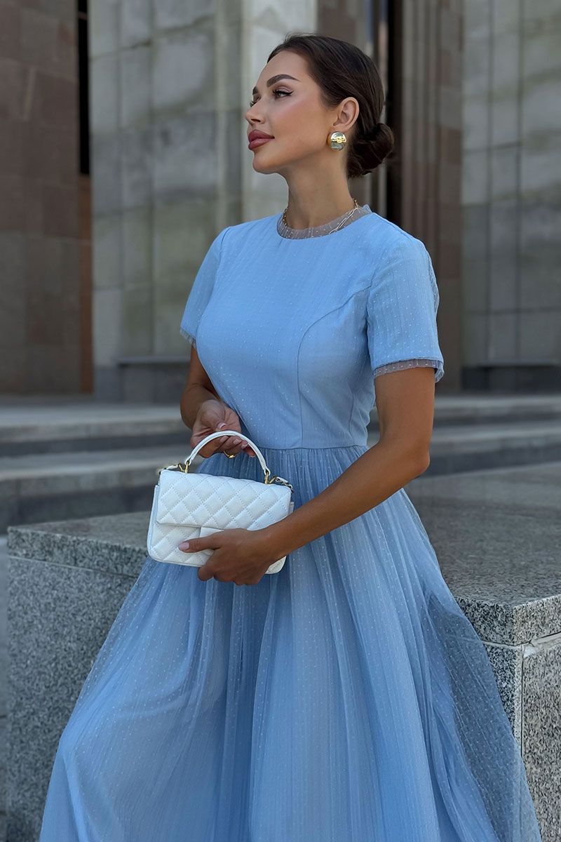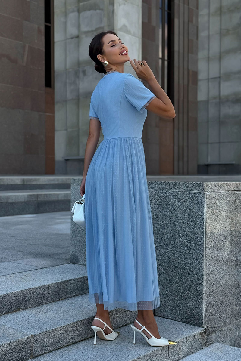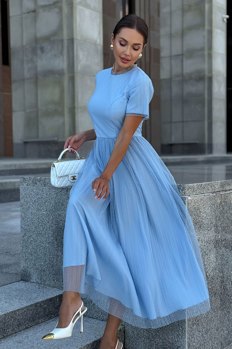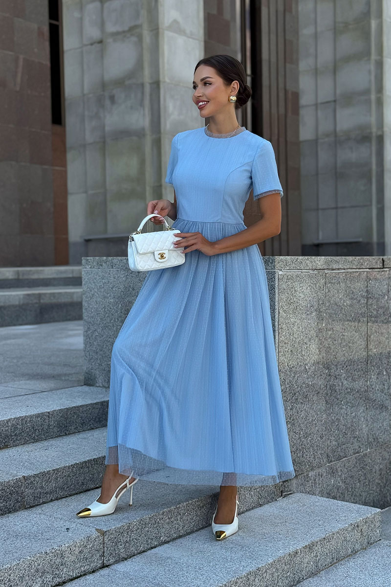 Голубое фатиновое платье женское URS - это тот самый наряд, который сразу создает ощущение праздника, легкости и продуманного стиля. Модель выглядит элегантно и женственно, подходит для торжественных событий, выпускного вечера, свадьбы или особого семейного праздника, когда хочется выглядеть безупречно и уверенно. Платье женское ЮРС, полуприлегающего силуэта, отрезное по линии талии, двухслойное, выполнено из плательной ткани в сочетании с сеткой. Верхний слой из отделочной ткани - сетка, нижний слой из плательной ткани. Лиф платья переда и спинки с рельефными швами, идущими из пройм вниз до шва талии. Верхняя часть спинки со средним швом от горловины до низа платья. От горловины вниз в среднем шве расположена застежка на потайную тесьму - "молнию". Юбка из сетки по срезу талии собрана на сборку. Горловина круглой формы обтачная. с притачной узкой деталью из сетки.