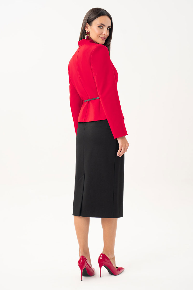 Спинка со средним и рельефными швами. Рукава втачные, двухшовные, длинные. Горловина ˅- образная, переходящая в воротник - стойку по спинке. Жакет с плечевыми накладками.