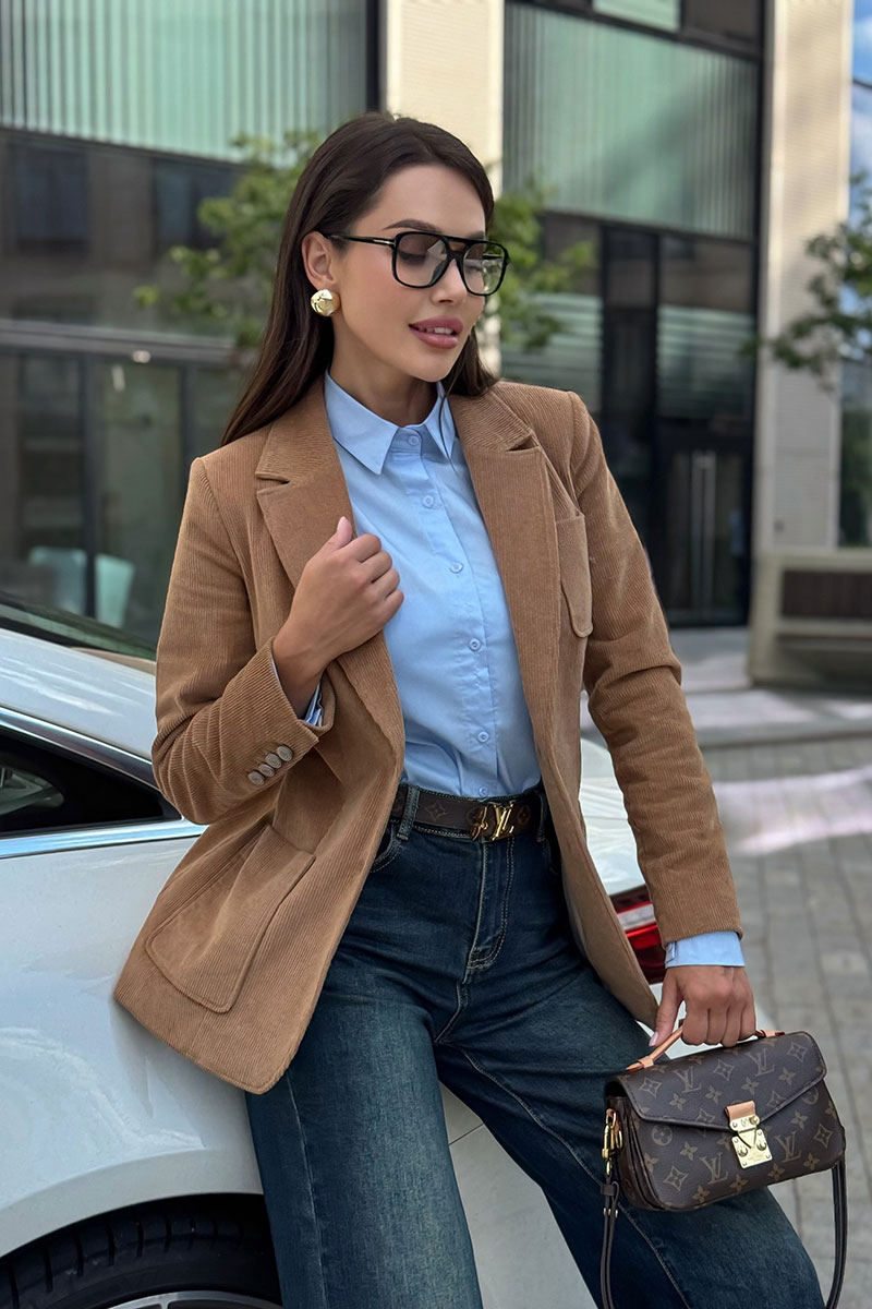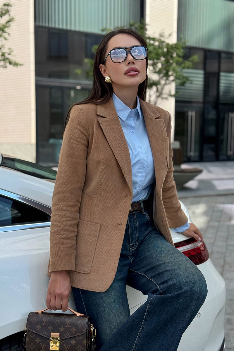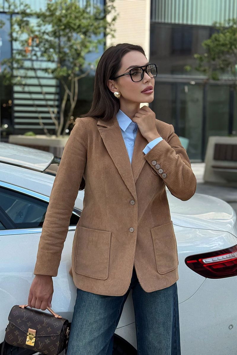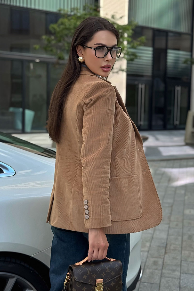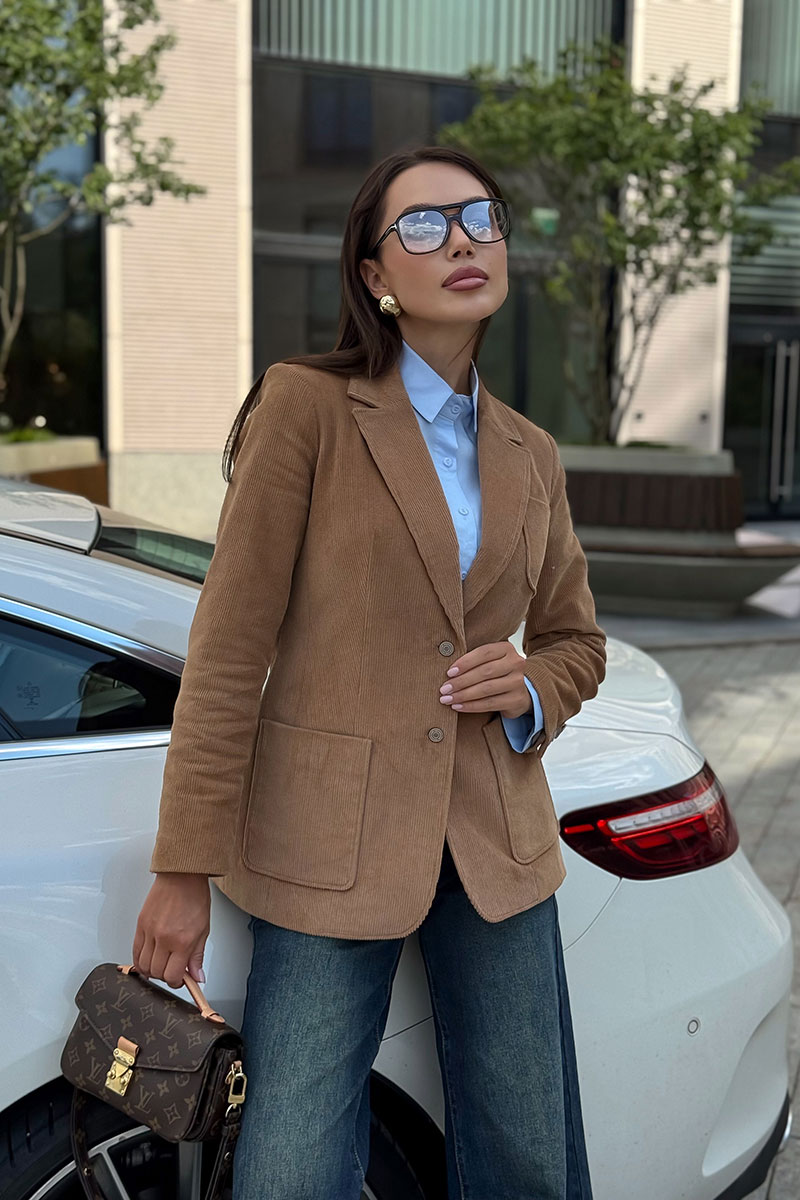 Жакет женский вельветовый коричневый URS — это сочетание элегантного стиля и практичности. Классический приталенный крой, лацканы и застёжка на пуговицы делают его универсальным