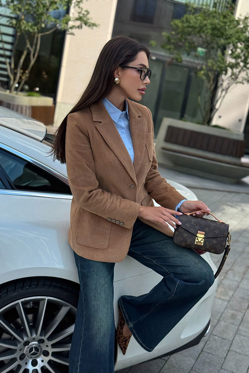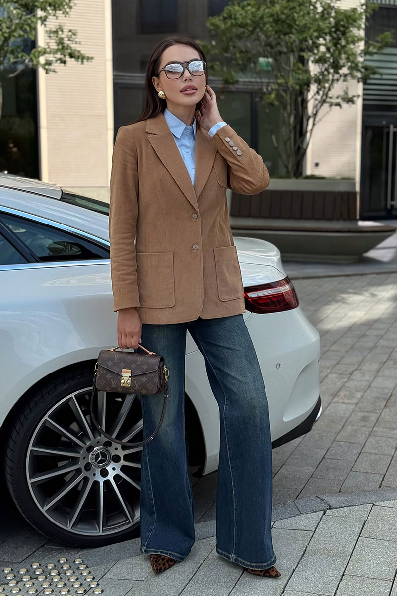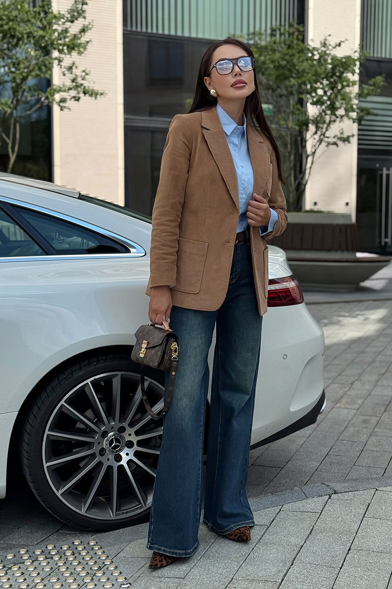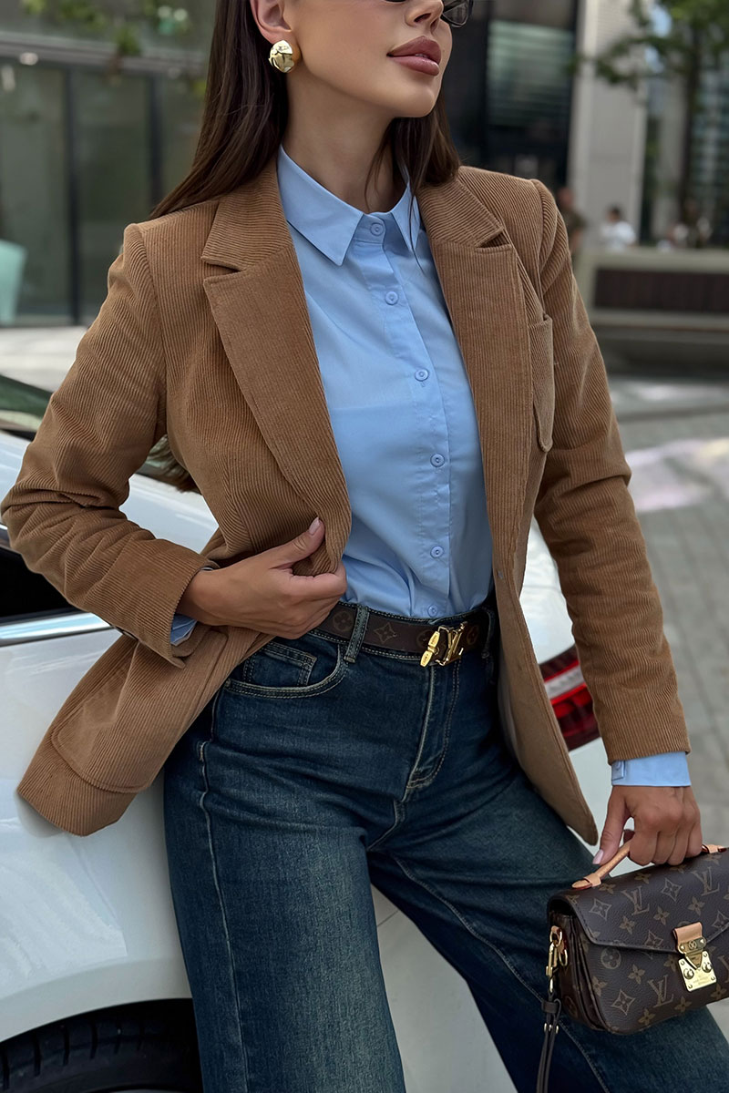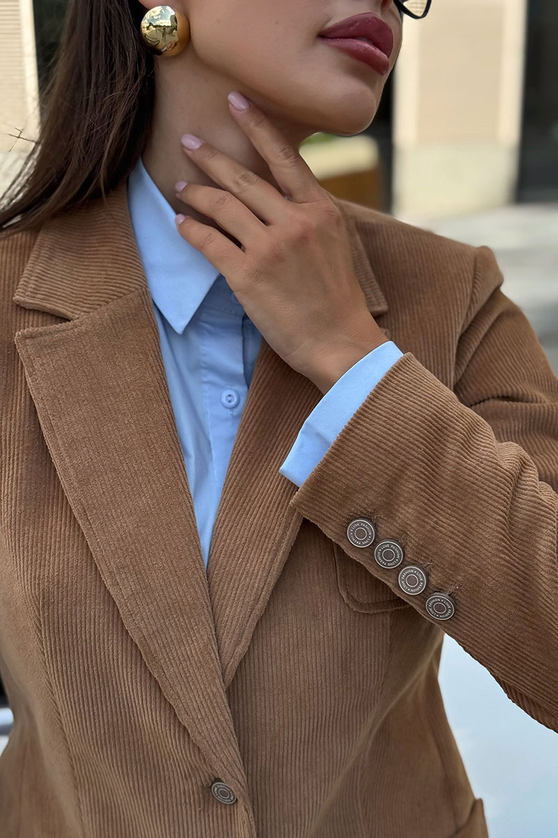 Жакет женский вельветовый коричневый URS — это сочетание элегантного стиля и практичности. Классический приталенный крой, лацканы и застёжка на пуговицы делают его универсальным