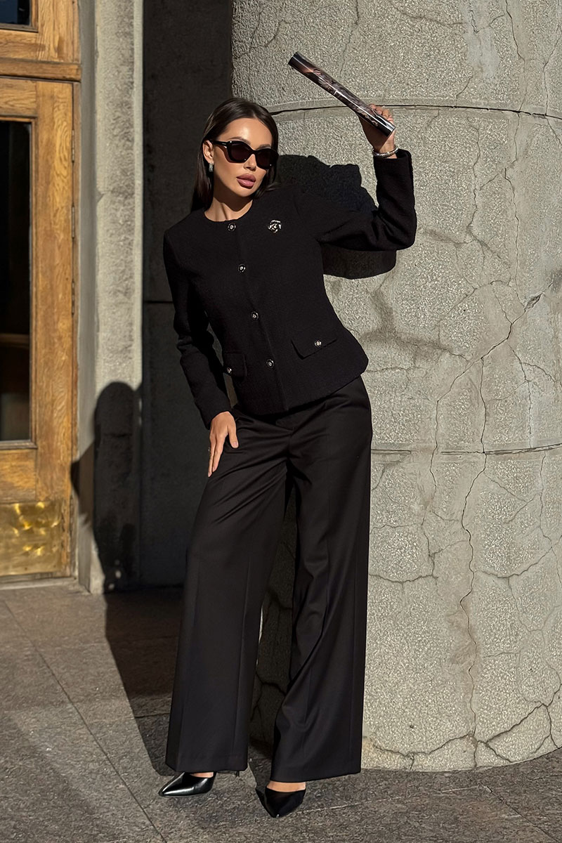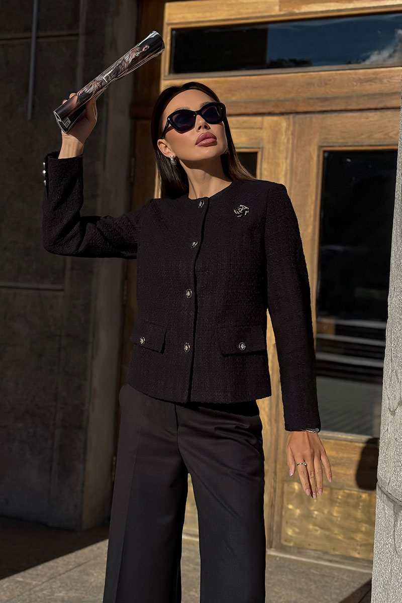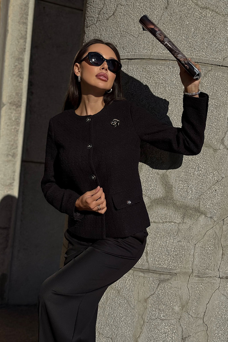 декоративной брошью, с центральной бортовой застежкой на 4 петли и пуговицы (размер и цвет фурнитуры может незначительно отличаться от фото). Жакет может быть как нарядным, так и