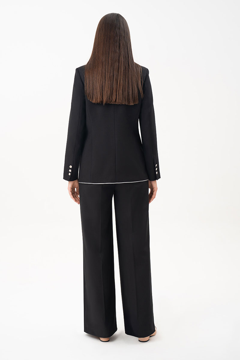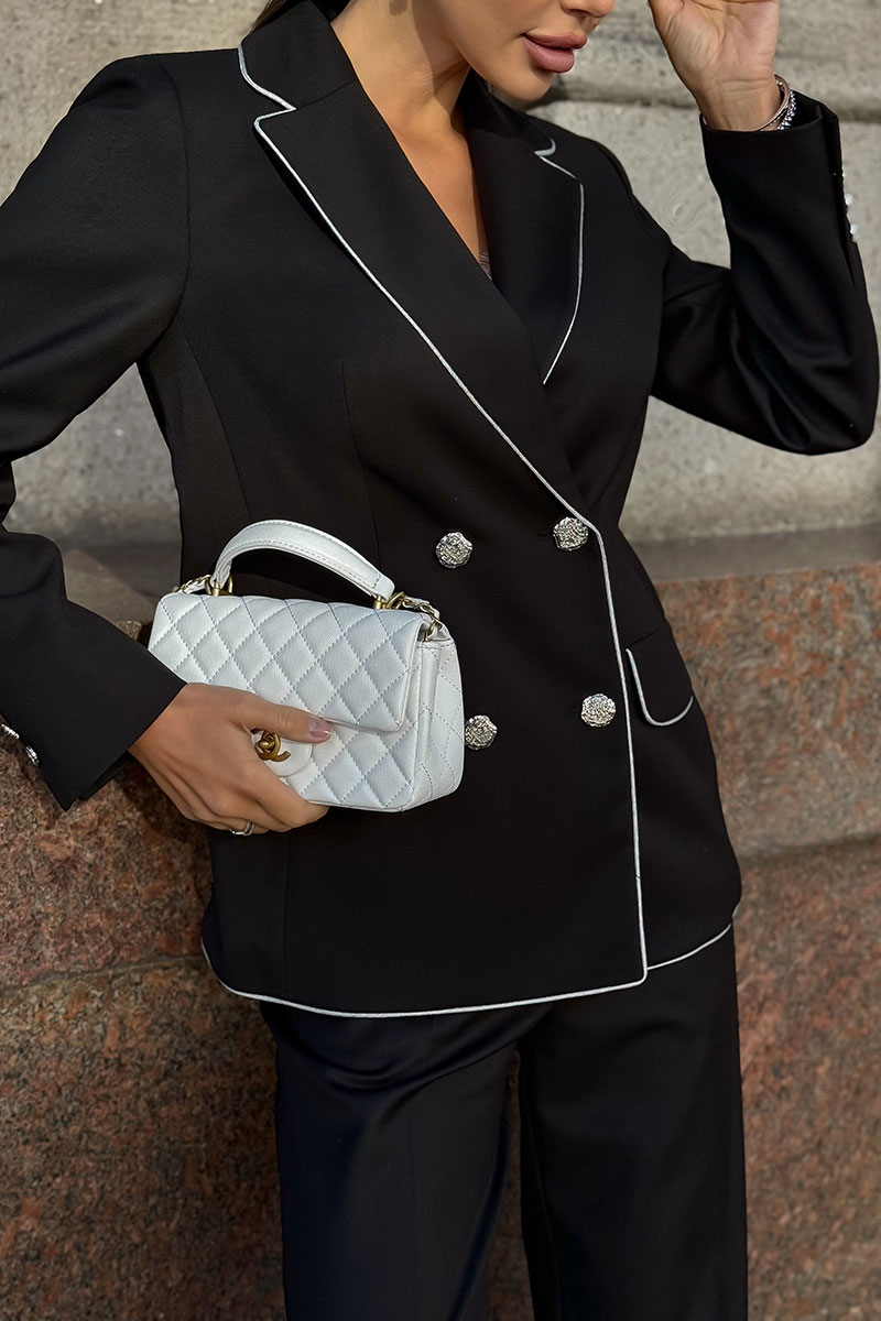 классику в лучших традициях деловой моды. Элегантный жакет с серебристым кантом и аккуратными декоративными пуговицами придает образу изысканность и подчеркивает статус. Прямые брюки