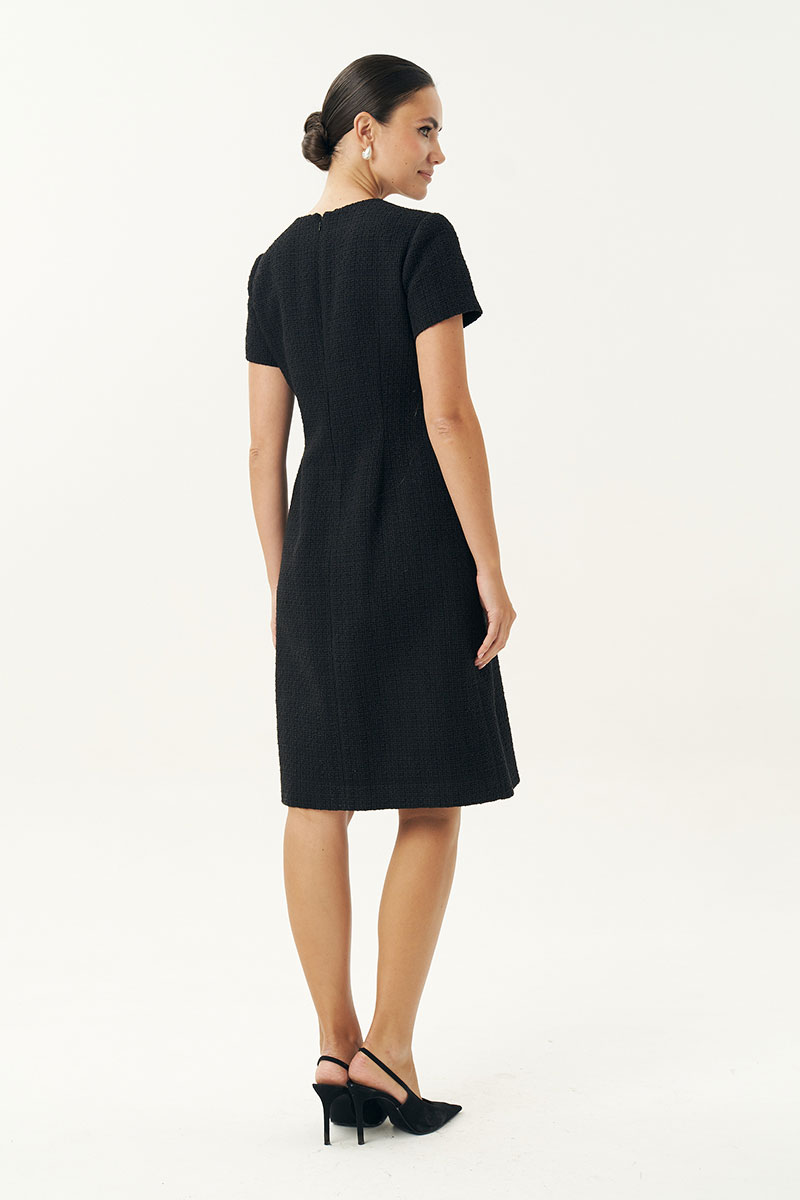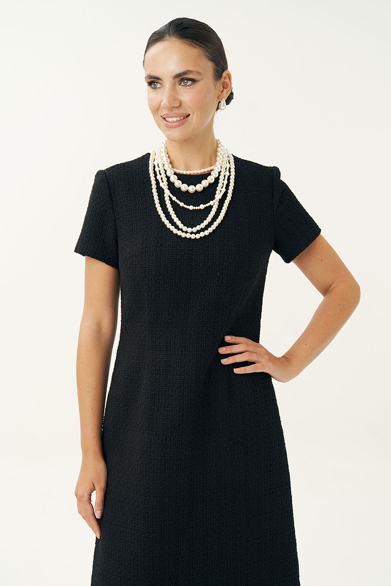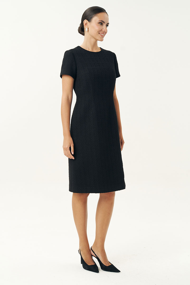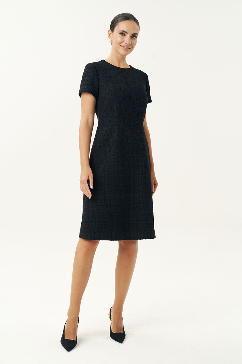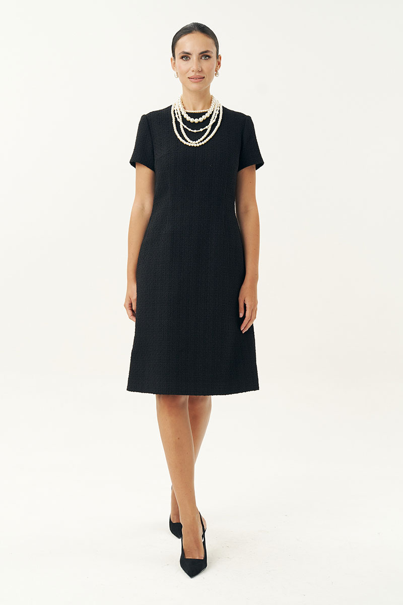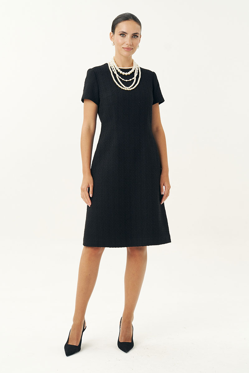 Неизменно, черное маленькое платье остается образцом элегантности… Платье женское, выполнено из костюмной твидовой ткани, полуприлегающего силуэта, расширенное к низу, на трикотажной