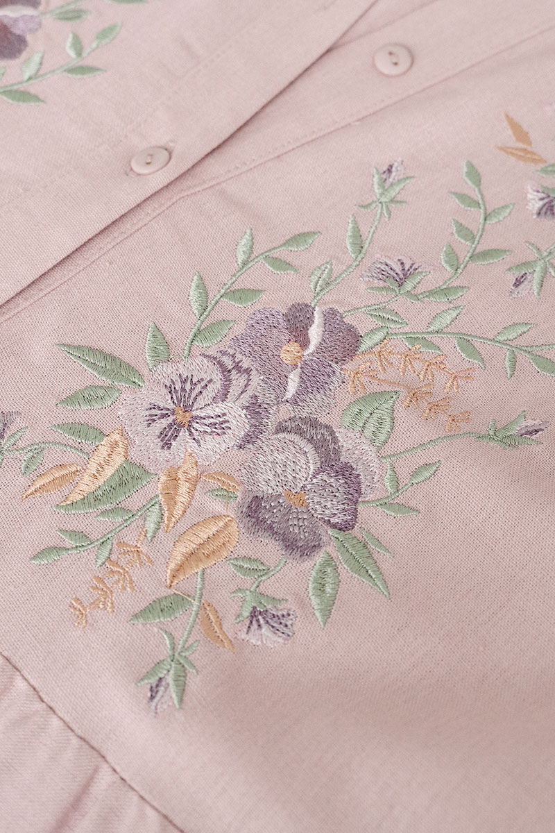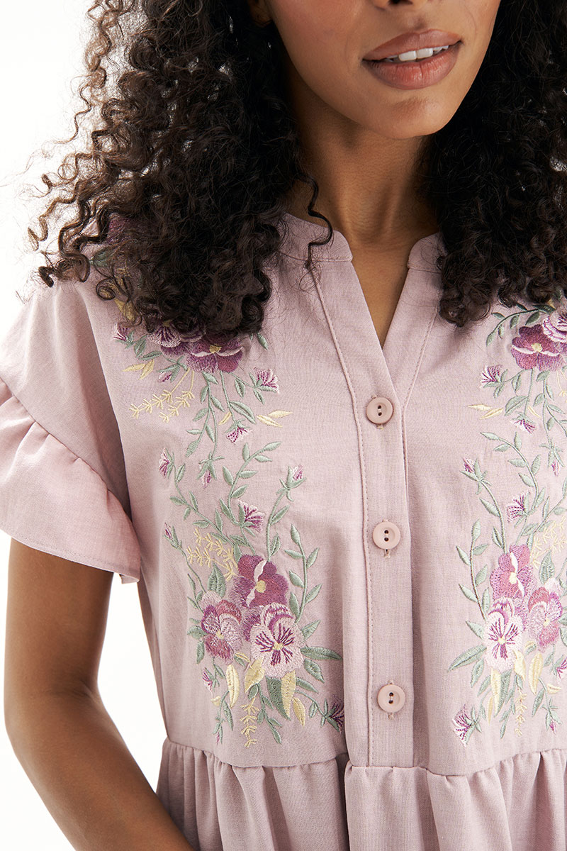 Модель выполнена из дышащей льняной ткани, которая обеспечивает комфорт даже в самый жаркий день. Рукав с мягкой сборкой подчёркивает романтичный стиль, а свободный А-силуэт подходит для любой фигуры. Элегантная вышивка на груди придаёт образу изысканный акцент и подчёркивает внимание к деталям.