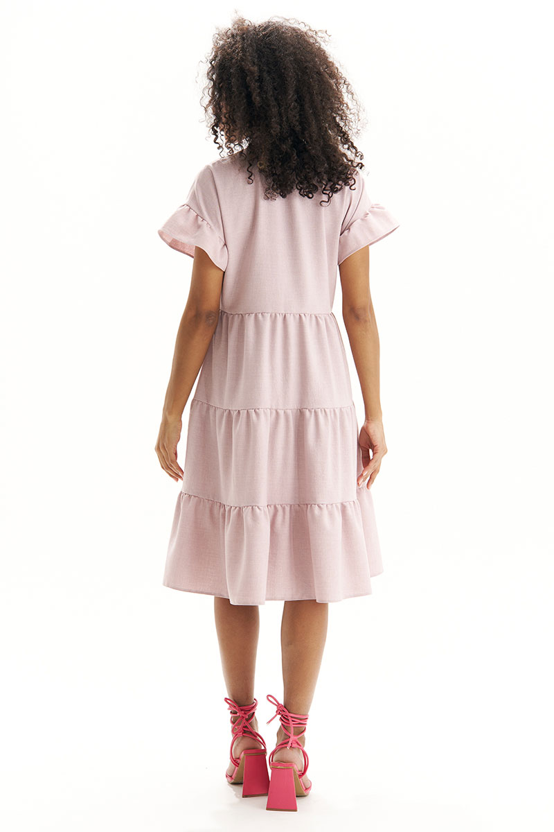 Горловина круглой формы, по переду с отрезными фигурными планками. Нижняя часть платья переда и спинки с тремя ярусами воланов со сборкой.
